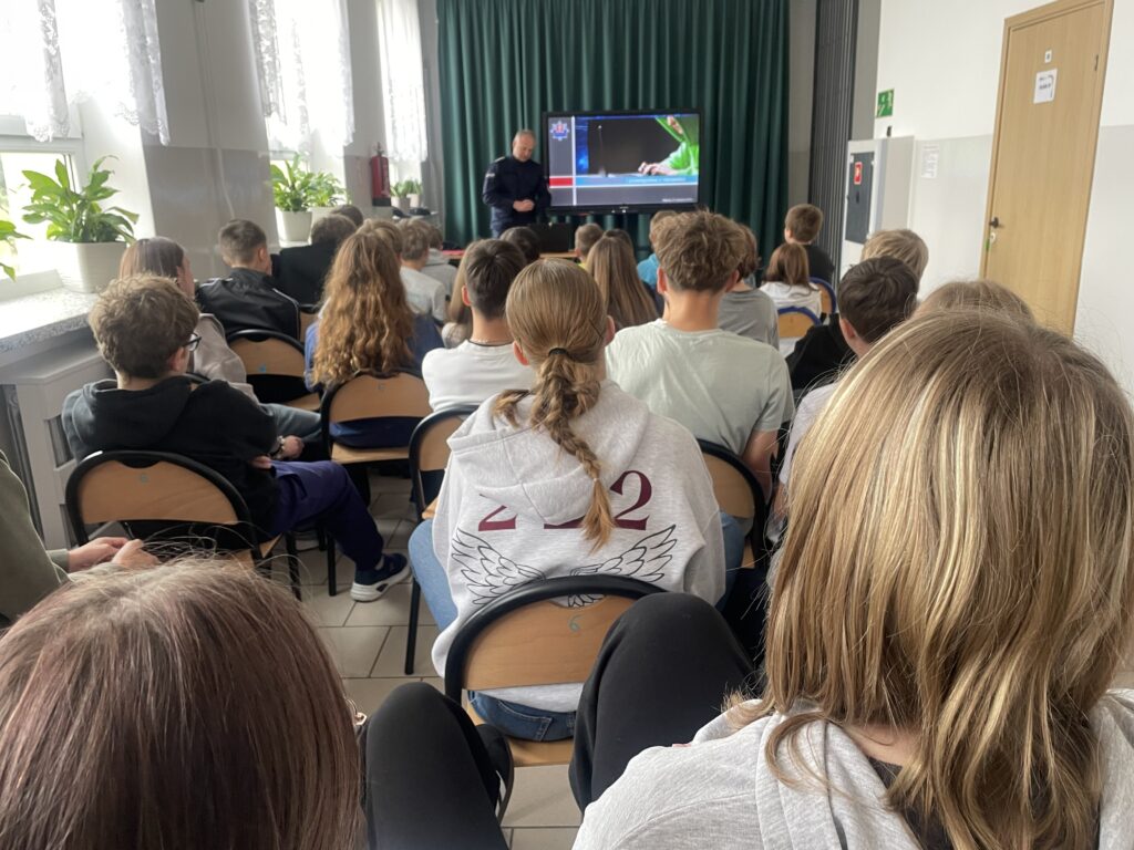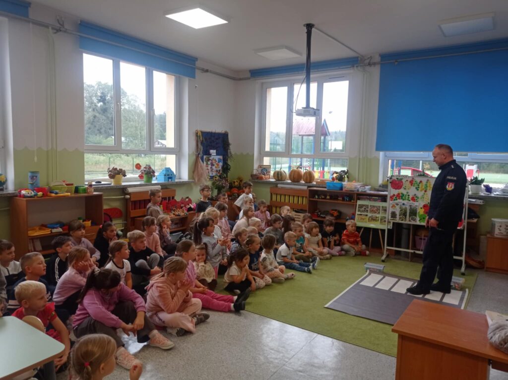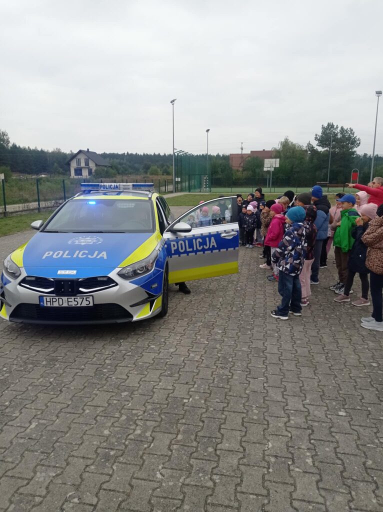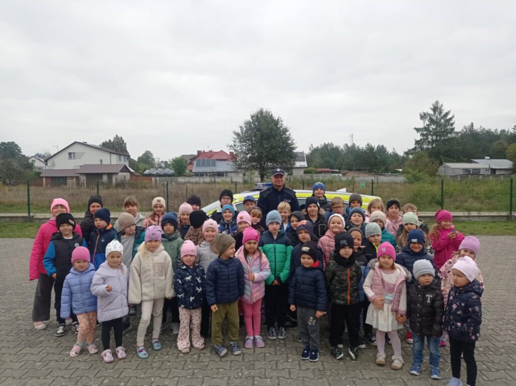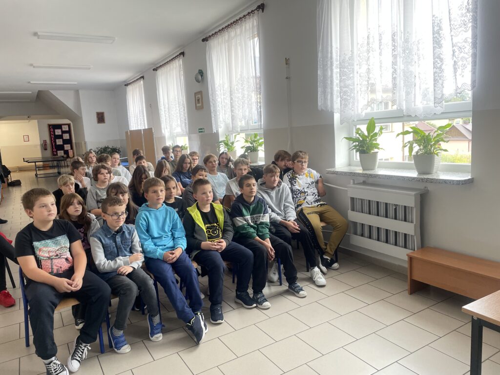 3 października  naszą szkołę odwiedził funkcjonariusz Komendy Powiatowej Policji w Biłgoraju, który spotkał się z dziećmi i młodzieżą aby przybliżyć im specyfikę zawodu policjanta oraz porozmawiać o bezpieczeństwie. Podczas spotkania uczniowie mieli okazję dowiedzieć się, jak wygląda codzienna praca policjanta, a także utrwalić zasady bezpiecznego poruszania się po drogach. W ramach udziału naszej szkoły w  akcji „Tydzień Przeciwdziałania Przemocy”  policjant poruszył również ważny temat przemocy oraz cyberprzemocy – jej rozpoznawania, zapobiegania oraz reagowania w sytuacjach zagrożenia. Na zakończenie spotkania każdy uczeń otrzymał odblask – nie tylko jako miłą pamiątkę, ale przede wszystkim jako element poprawiający widoczność i bezpieczeństwo na drodze.