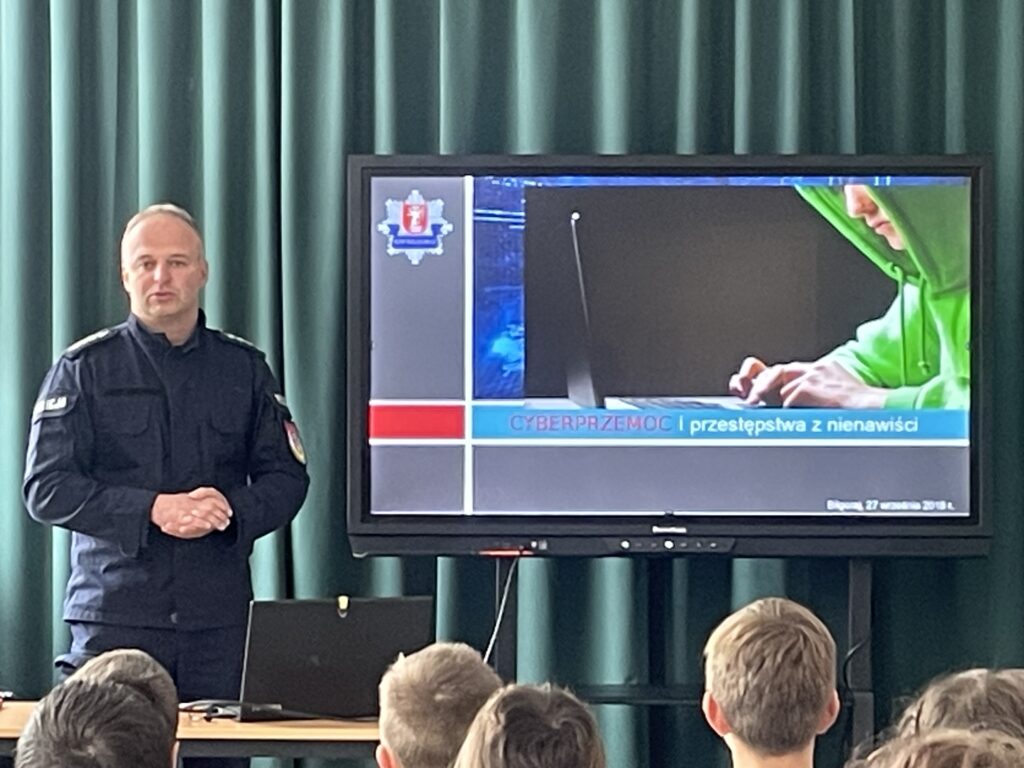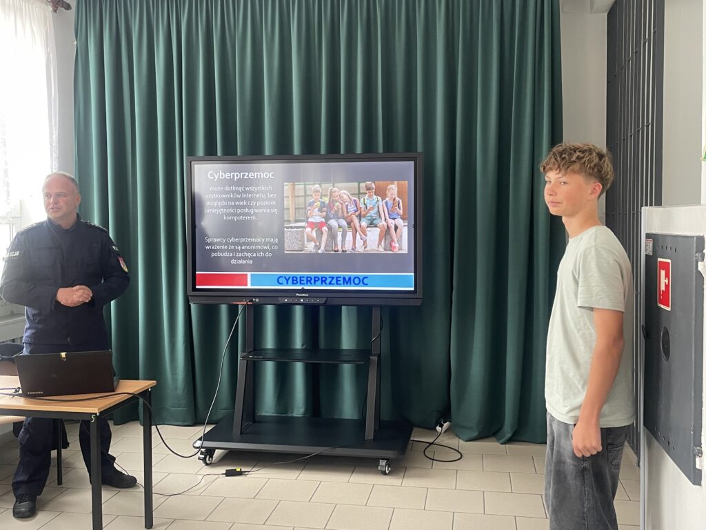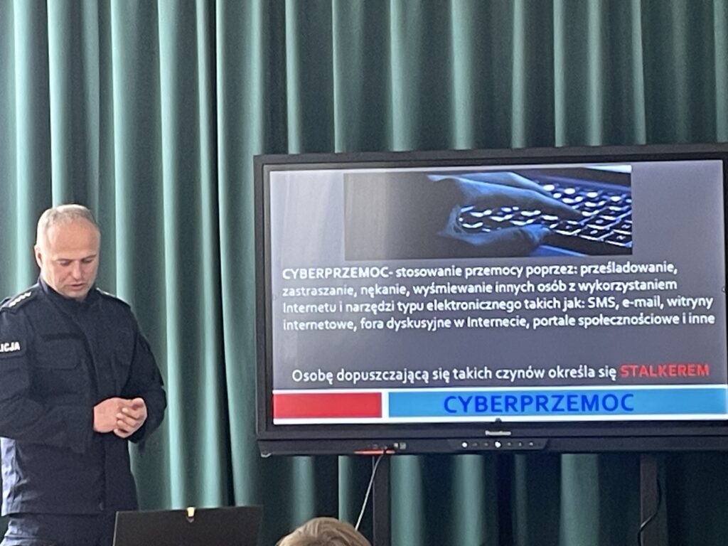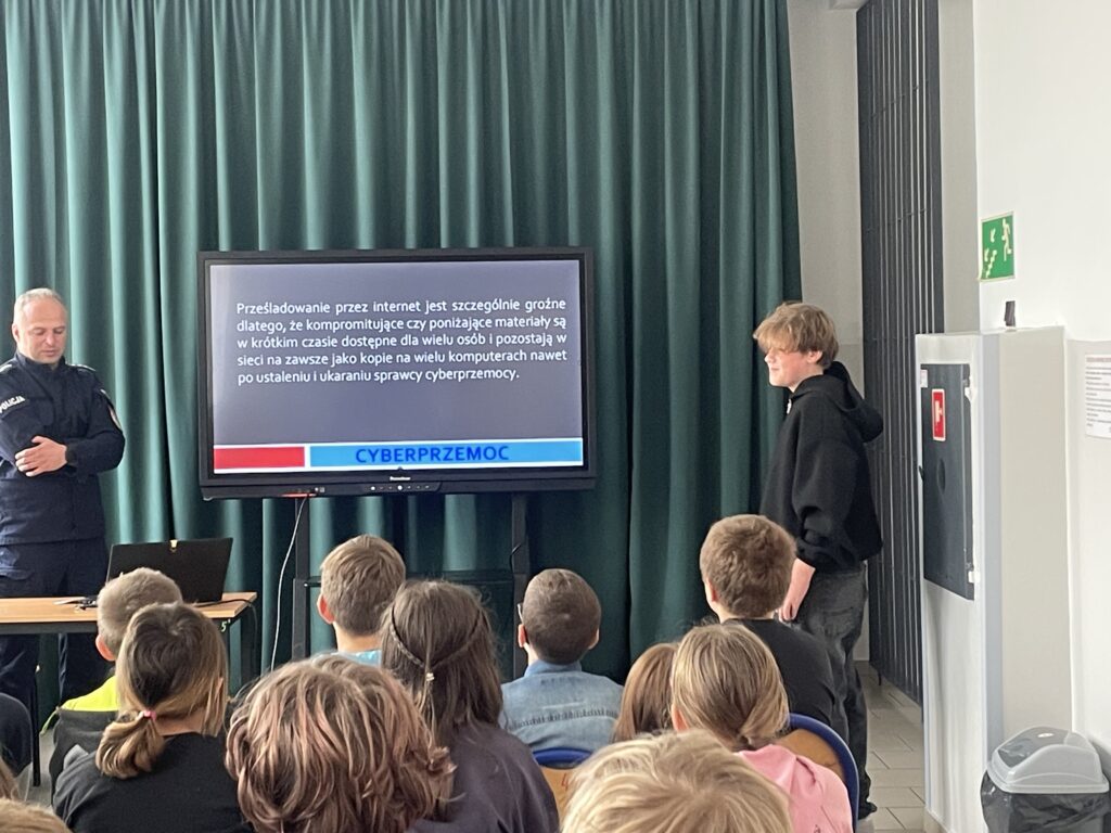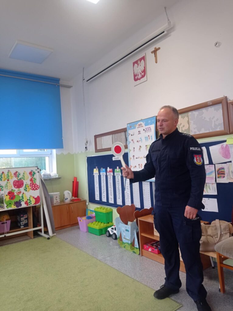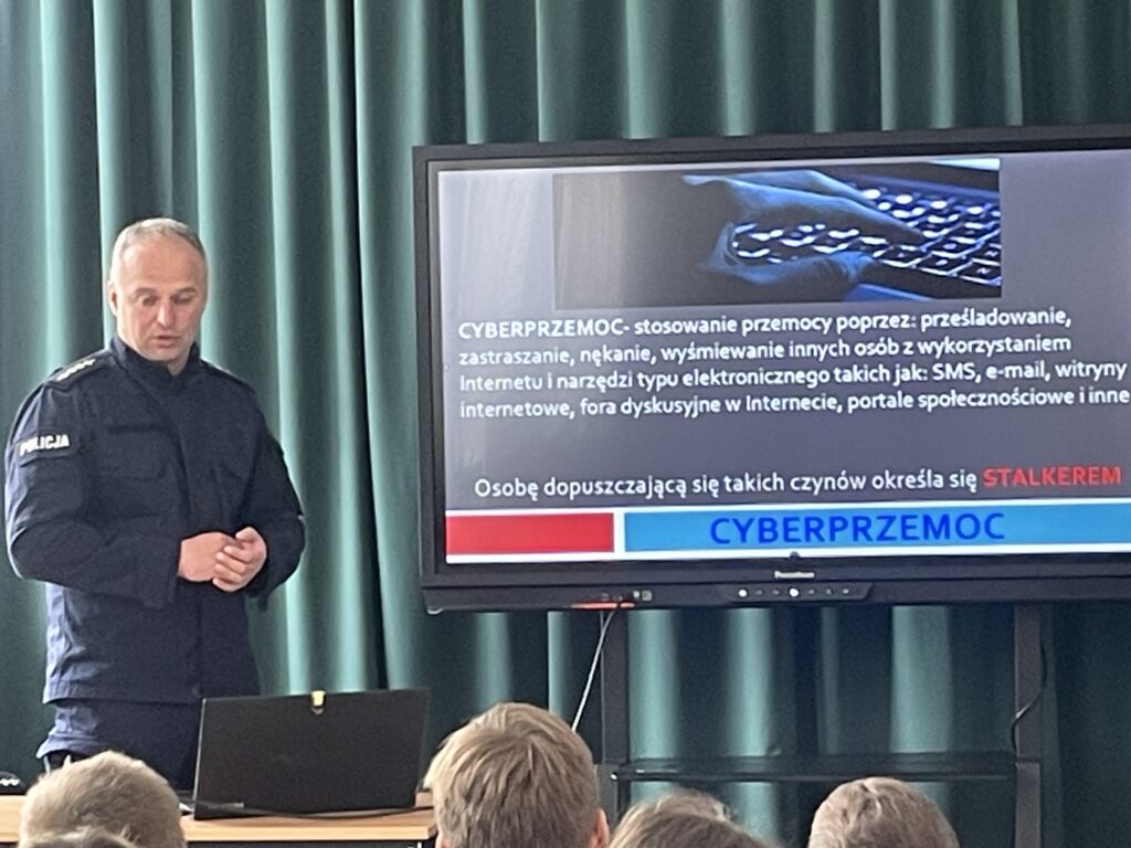 3 października  naszą szkołę odwiedził funkcjonariusz Komendy Powiatowej Policji w Biłgoraju, który spotkał się z dziećmi i młodzieżą aby przybliżyć im specyfikę zawodu policjanta oraz porozmawiać o bezpieczeństwie. Podczas spotkania uczniowie mieli okazję dowiedzieć się, jak wygląda codzienna praca policjanta, a także utrwalić zasady bezpiecznego poruszania się po drogach. W ramach udziału naszej szkoły w  akcji „Tydzień Przeciwdziałania Przemocy”  policjant poruszył również ważny temat przemocy oraz cyberprzemocy – jej rozpoznawania, zapobiegania oraz reagowania w sytuacjach zagrożenia. Na zakończenie spotkania każdy uczeń otrzymał odblask – nie tylko jako miłą pamiątkę, ale przede wszystkim jako element poprawiający widoczność i bezpieczeństwo na drodze.