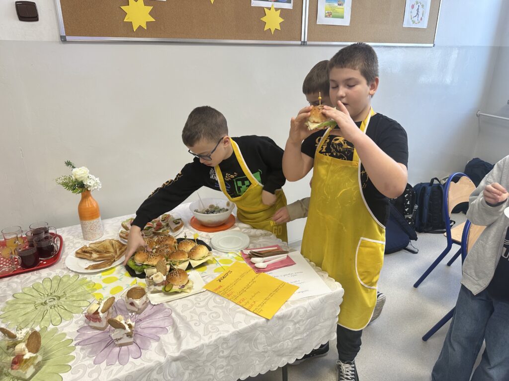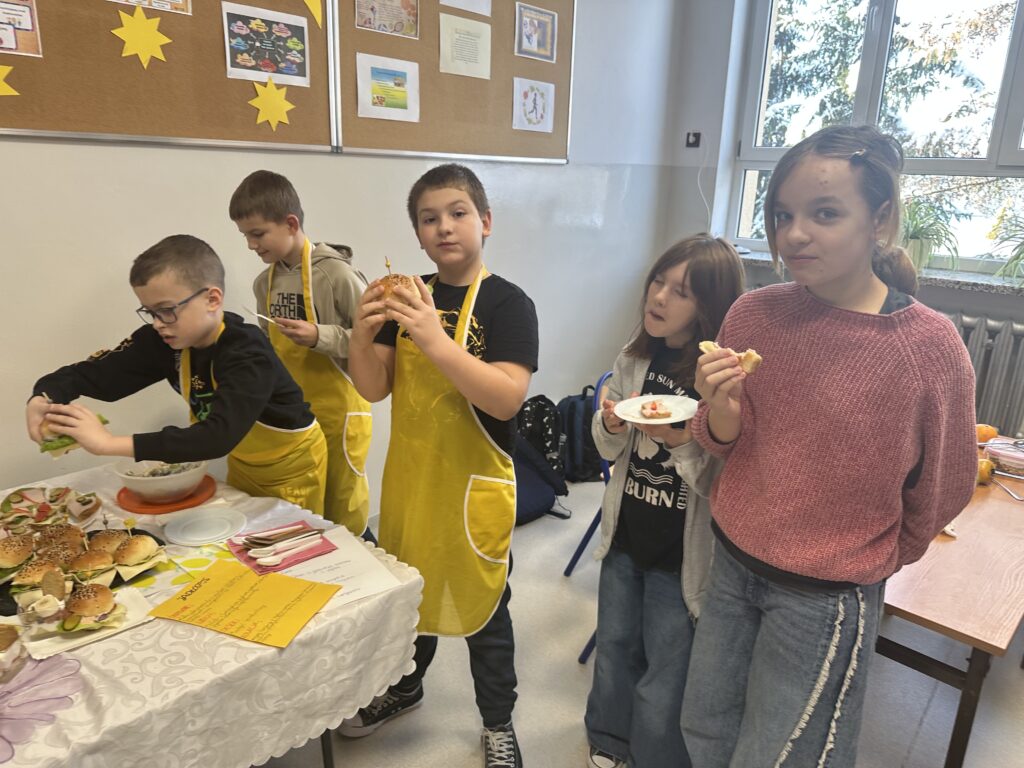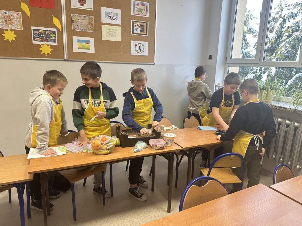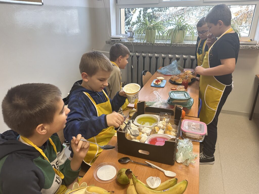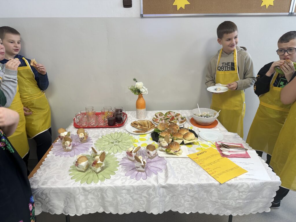 Czy zdrowe jedzenie może być smaczne i apetyczne? Na takie pytanie próbowali odpowiedzieć uczniowie klasy czwartej realizując swój pierwszy samodzielny projekt z przyrody. Celem projektu było opracowanie jadłospisu i wykonanie pełnowartościowego, zdrowego posiłku: śniadania, lunchu- deseru, przekąsek oraz kolacji. Uczniowie zostali podzieleni na trzy grupy, każdej grupie przydzielone zostały zadania. Czwartoklasiści perfekcyjne przygotowali się do wykonania zadań, opracowali jadłospisy, przynieśli do szkoły niezbędne produkty i sprzęt. Przygotowali pyszne i zdrowe dania, których zapach przyciągał pod salę numer 28 innych uczniów i nauczycieli. Potrawy zostały zaprezentowane i zjedzone. Poczęstowani zostali także inni uczniowie, nauczyciele i pan dyrektor. Projekt dał uczniom możliwość wykazania się w sposób twórczy pod względem myślenia i działania, dzięki czemu stali się bardziej samodzielni i kreatywni w zdobywaniu wiedzy, umiejętności oraz nawyków żywieniowych. Uwrażliwiał ich na kwestie odpowiedzialności za własne zdrowie.