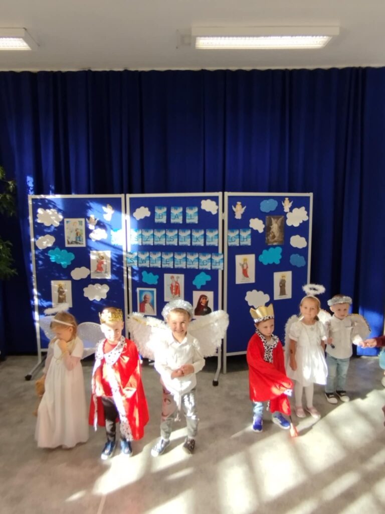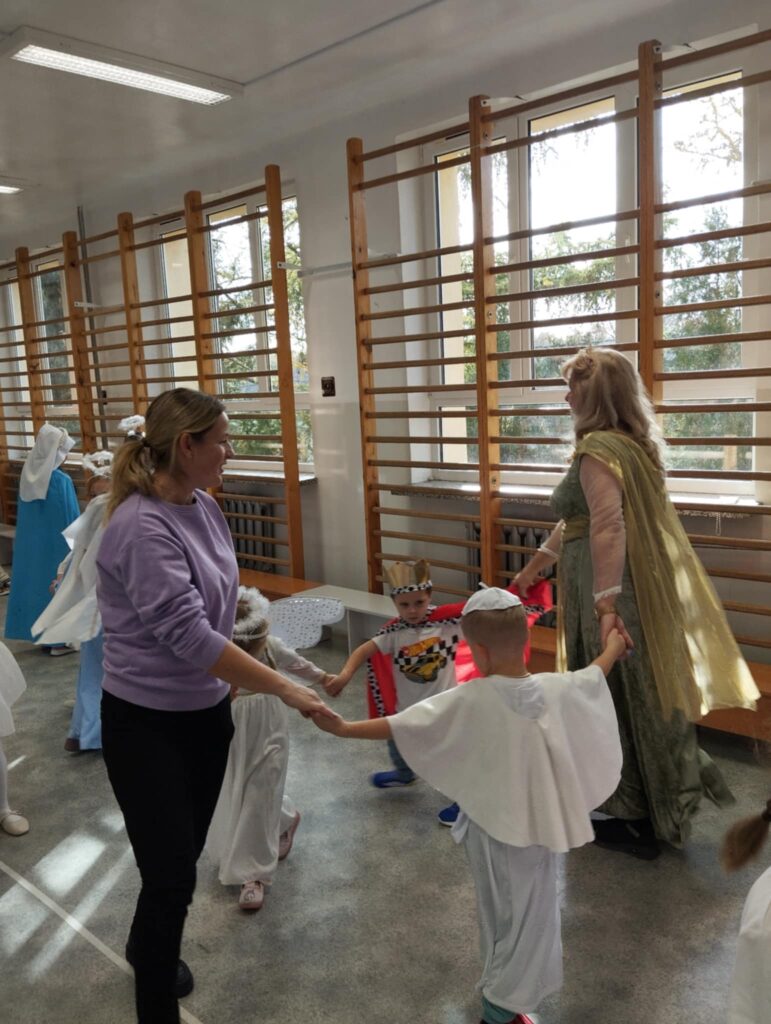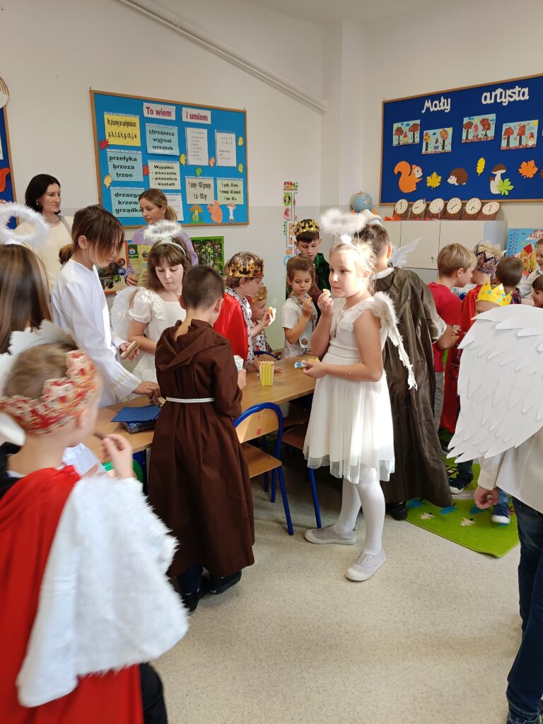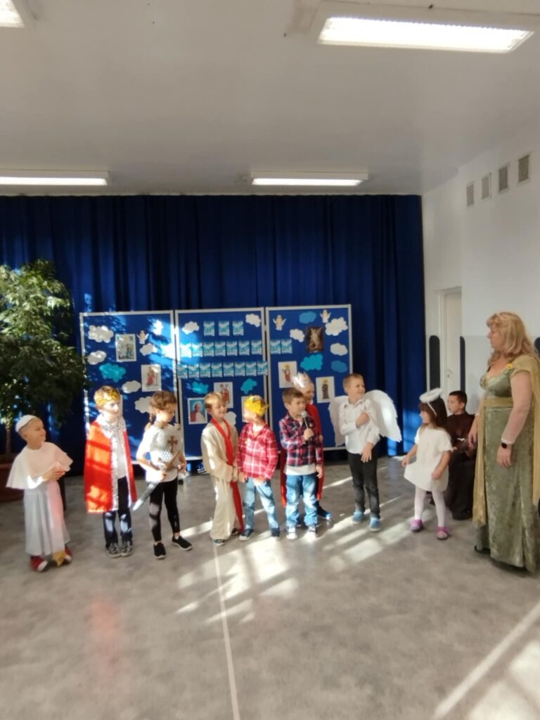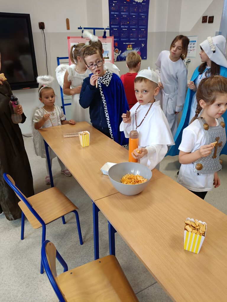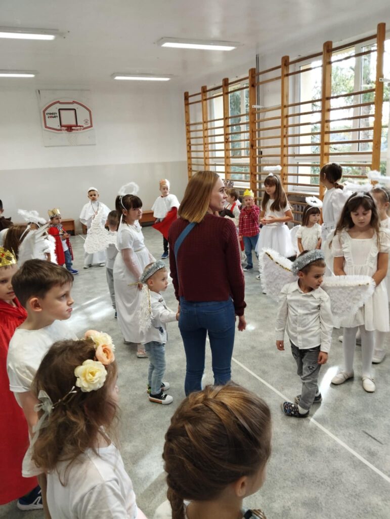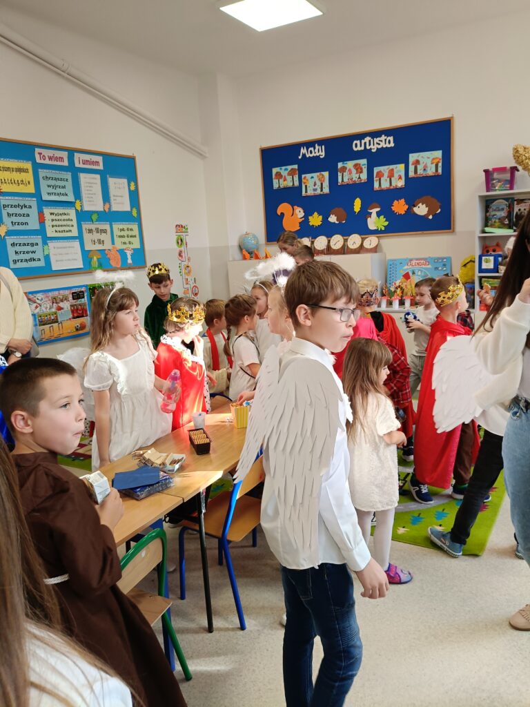 Dnia 30.X.2024r., z racji zbliżającej się Uroczystości Wszystkich Świętych, już po raz kolejny odbył się w naszej szkole Bal Wszystkich Świętych – „ Ze świętymi za pan brat”. Tego dnia było jak w niebie. Przedszkolaki oraz uczniowie klas 1-4 wykazali się dużą pomysłowością i zaprezentowali się w niezwykłych strojach. Na parkiecie można było dostrzec postaci aniołów, ulubionych świętych i błogosławionych Kościoła Katolickiego. Celem tej inicjatywy jest wprowadzanie w atmosferę radości, uświadomienie istoty listopadowego wspominania świętych . Zabawa polegała na wybraniu sobie postaci świętego lub błogosławionego, wymyśleniu stroju dla swojego patrona nie zapominając o jego atrybutach i zaprezentowaniu swojej wiedzy o świętym. Na balu nie mogło zabraknąć dobrej zabawy. Dzieci wesoło bawiły się przy dźwiękach muzyki, tańczyły, śpiewały, brały udział w wesołych rywalizacjach. Był to piękny czas – pełen radości, uśmiechu i wspólnej zabawy.
