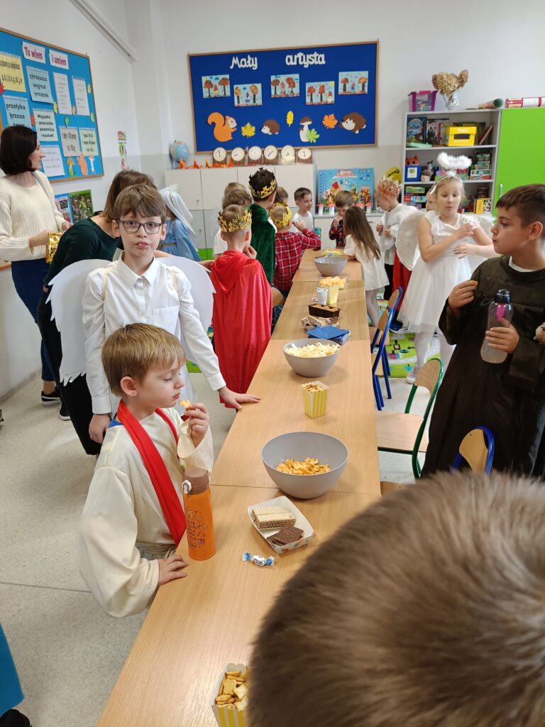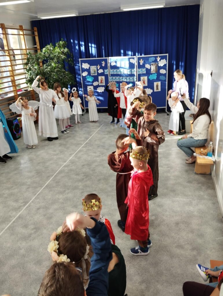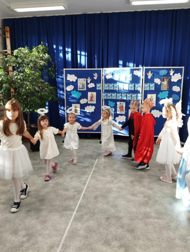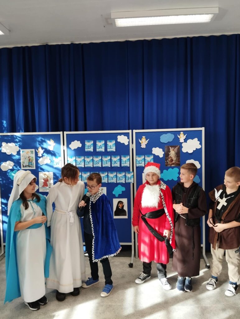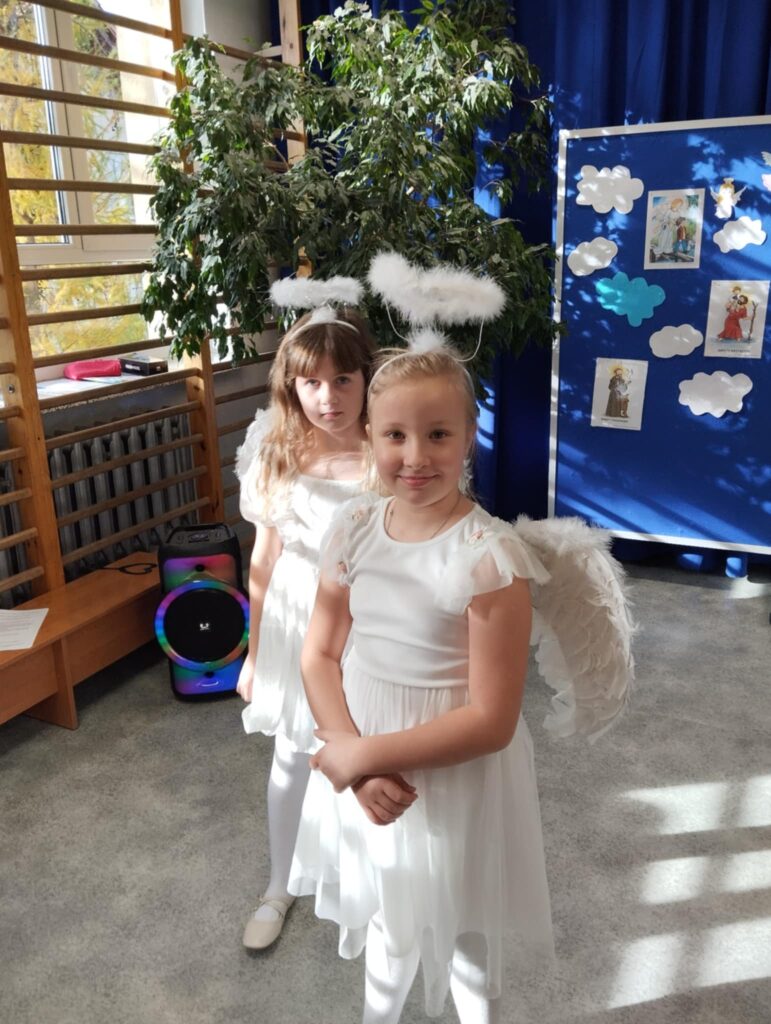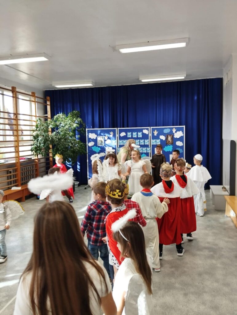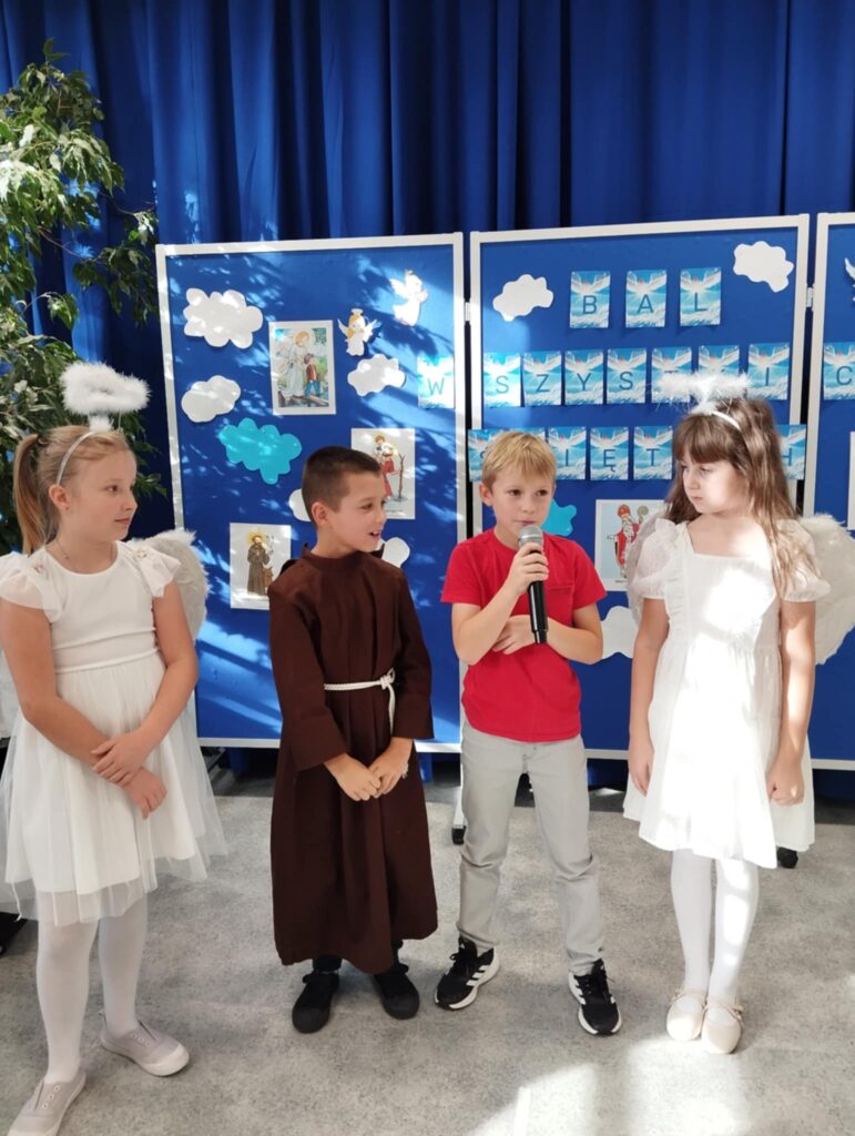 Dnia 30.X.2024r., z racji zbliżającej się Uroczystości Wszystkich Świętych, już po raz kolejny odbył się w naszej szkole Bal Wszystkich Świętych – „ Ze świętymi za pan brat”. Tego dnia było jak w niebie. Przedszkolaki oraz uczniowie klas 1-4 wykazali się dużą pomysłowością i zaprezentowali się w niezwykłych strojach. Na parkiecie można było dostrzec postaci aniołów, ulubionych świętych i błogosławionych Kościoła Katolickiego. Celem tej inicjatywy jest wprowadzanie w atmosferę radości, uświadomienie istoty listopadowego wspominania świętych . Zabawa polegała na wybraniu sobie postaci świętego lub błogosławionego, wymyśleniu stroju dla swojego patrona nie zapominając o jego atrybutach i zaprezentowaniu swojej wiedzy o świętym. Na balu nie mogło zabraknąć dobrej zabawy. Dzieci wesoło bawiły się przy dźwiękach muzyki, tańczyły, śpiewały, brały udział w wesołych rywalizacjach. Był to piękny czas – pełen radości, uśmiechu i wspólnej zabawy.