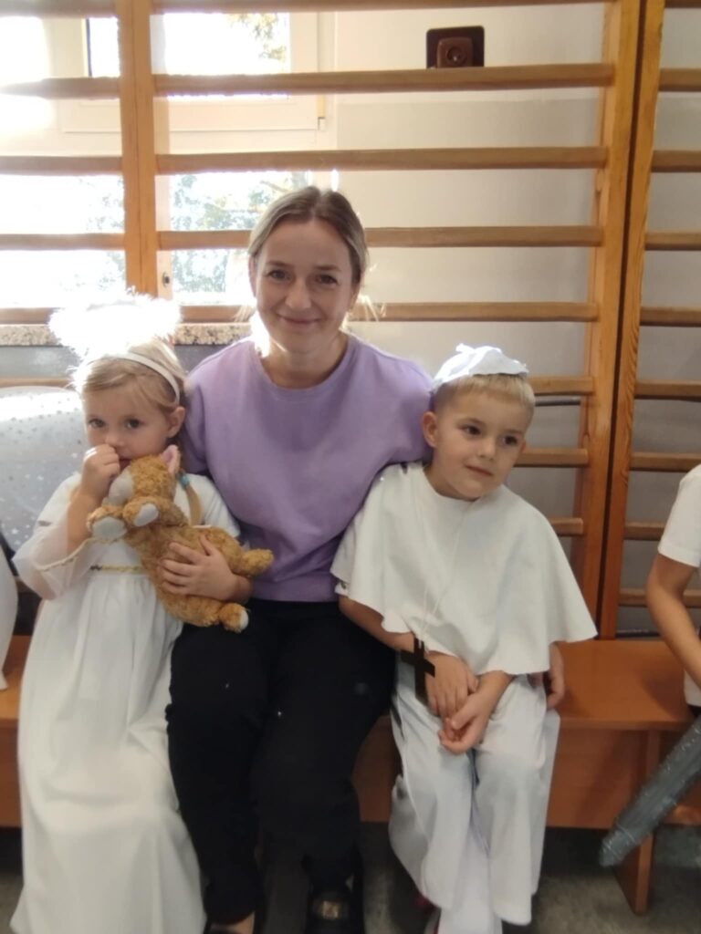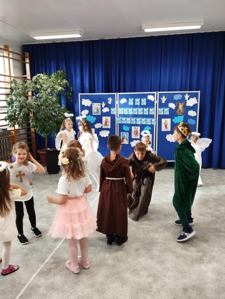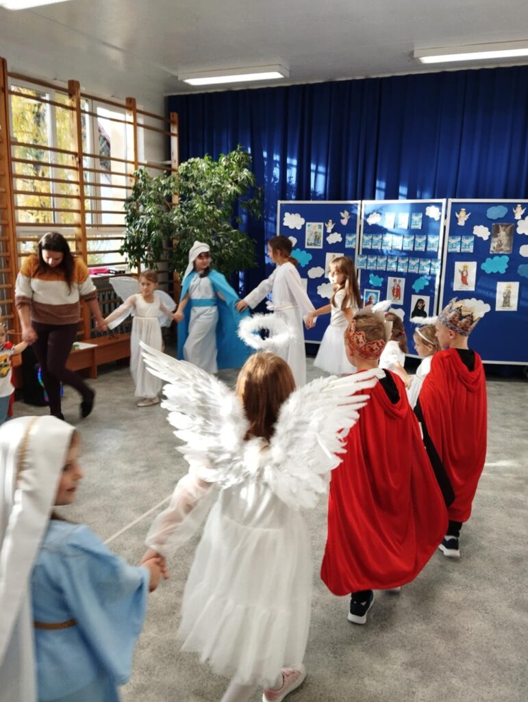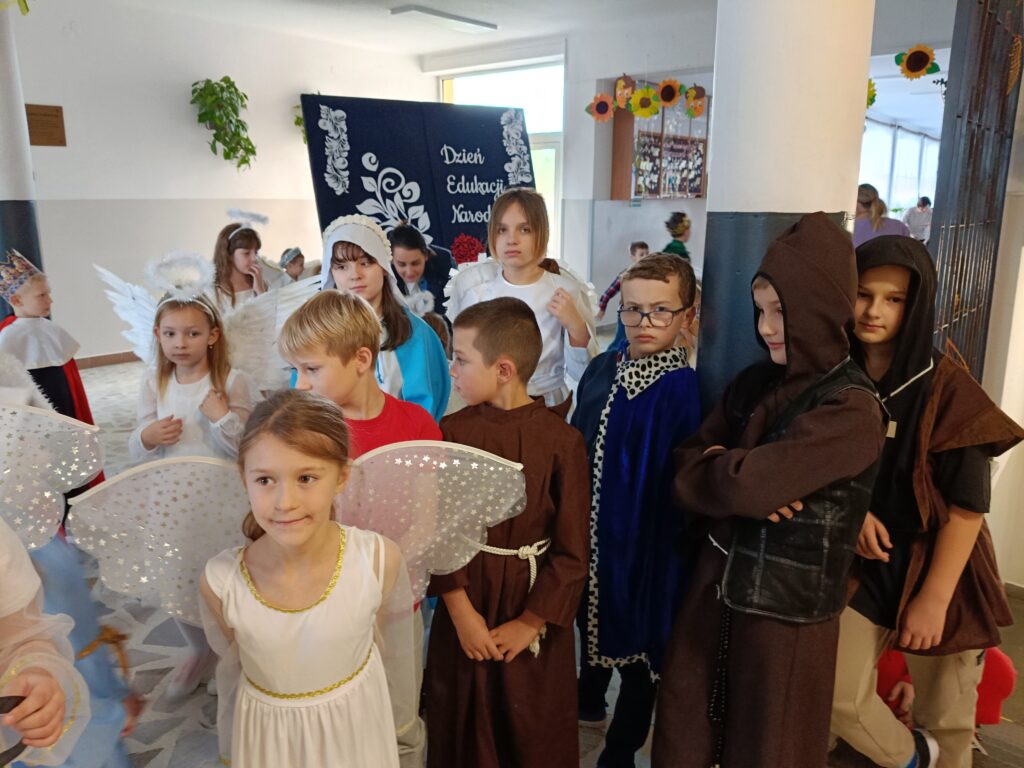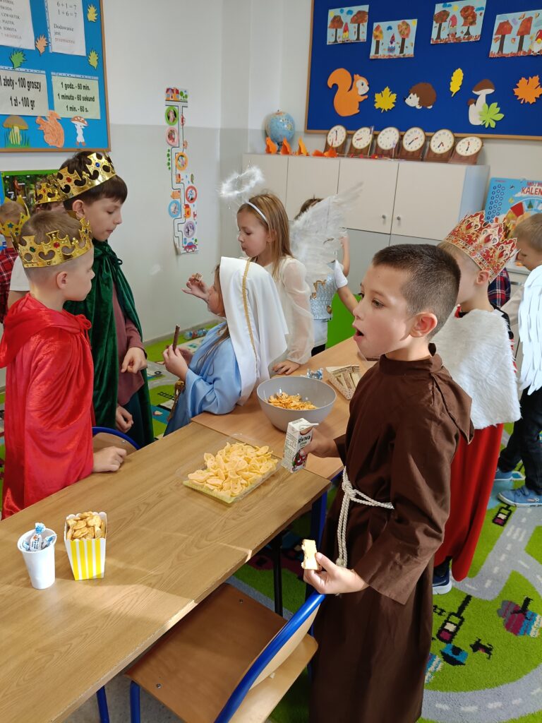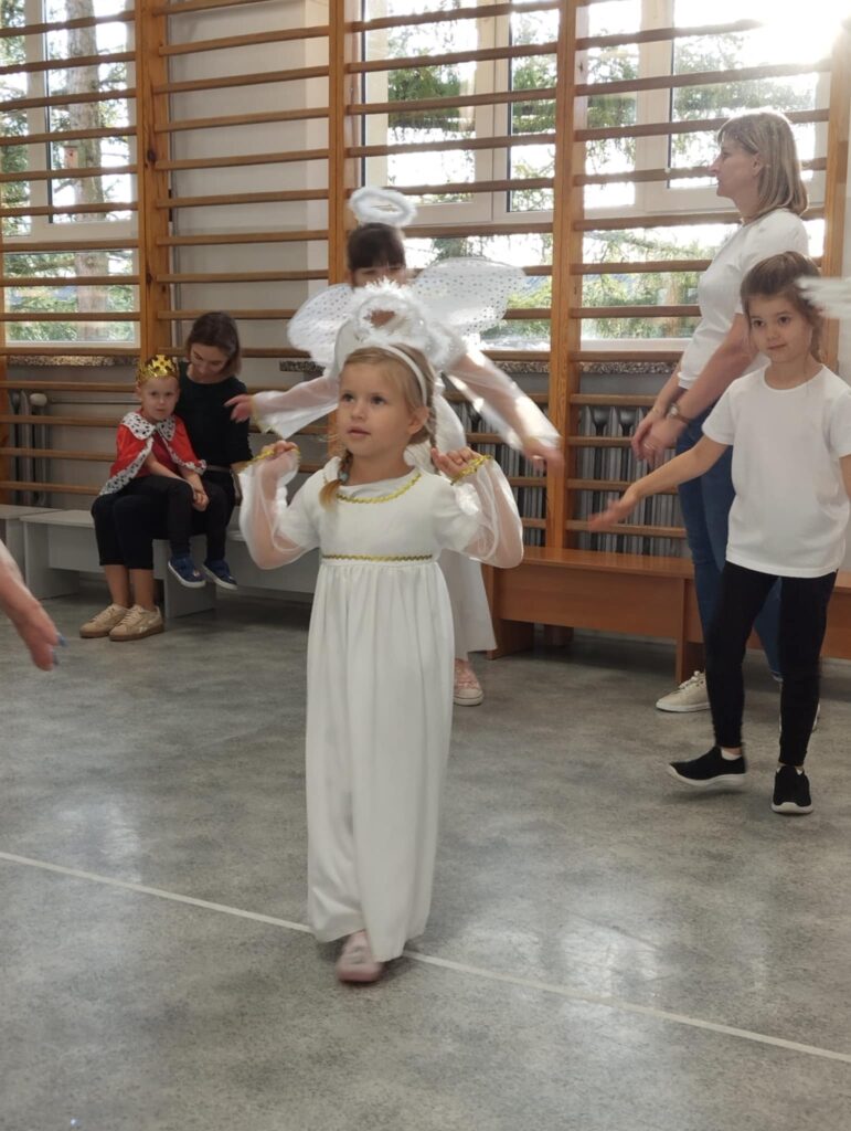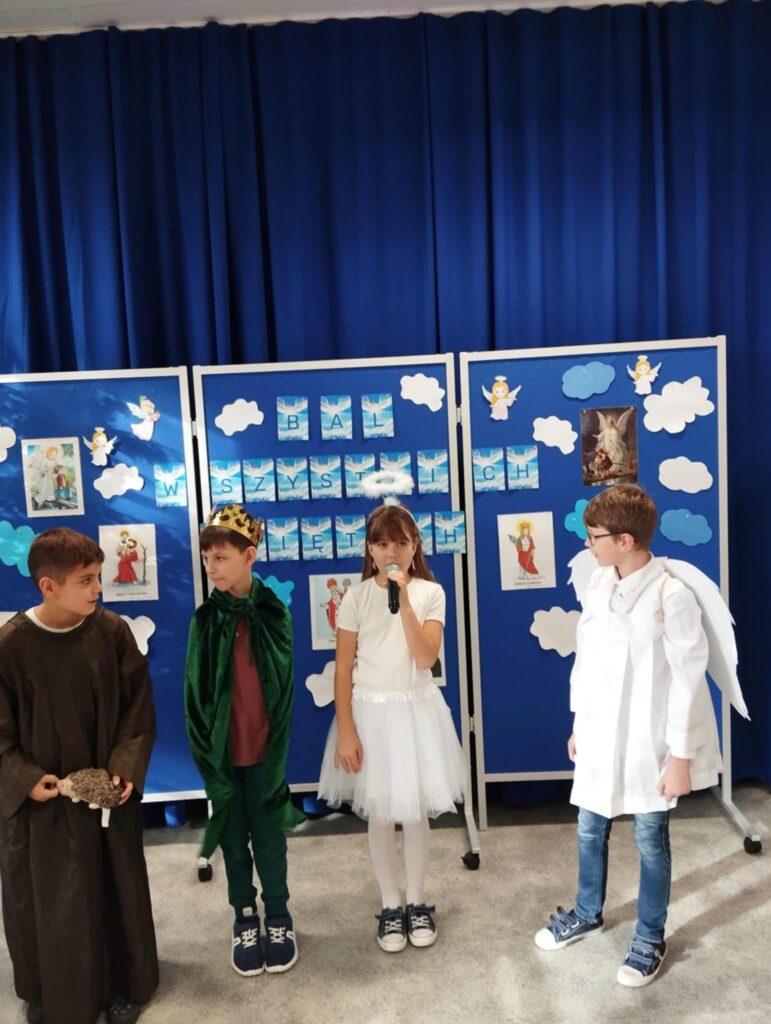Dnia 30.X.2024r., z racji zbliżającej się Uroczystości Wszystkich Świętych, już po raz kolejny odbył się w naszej szkole Bal Wszystkich Świętych – „ Ze świętymi za pan brat”. Tego dnia było jak w niebie. Przedszkolaki oraz uczniowie klas 1-4 wykazali się dużą pomysłowością i zaprezentowali się w niezwykłych strojach. Na parkiecie można było dostrzec postaci aniołów, ulubionych świętych i błogosławionych Kościoła Katolickiego. Celem tej inicjatywy jest wprowadzanie w atmosferę radości, uświadomienie istoty listopadowego wspominania świętych . Zabawa polegała na wybraniu sobie postaci świętego lub błogosławionego, wymyśleniu stroju dla swojego patrona nie zapominając o jego atrybutach i zaprezentowaniu swojej wiedzy o świętym. Na balu nie mogło zabraknąć dobrej zabawy. Dzieci wesoło bawiły się przy dźwiękach muzyki, tańczyły, śpiewały, brały udział w wesołych rywalizacjach. Był to piękny czas – pełen radości, uśmiechu i wspólnej zabawy.