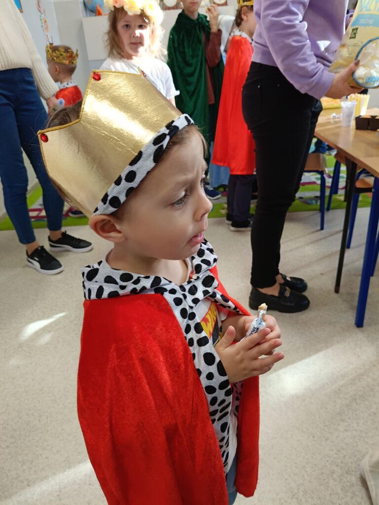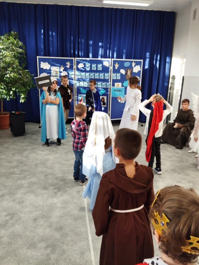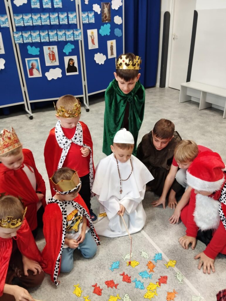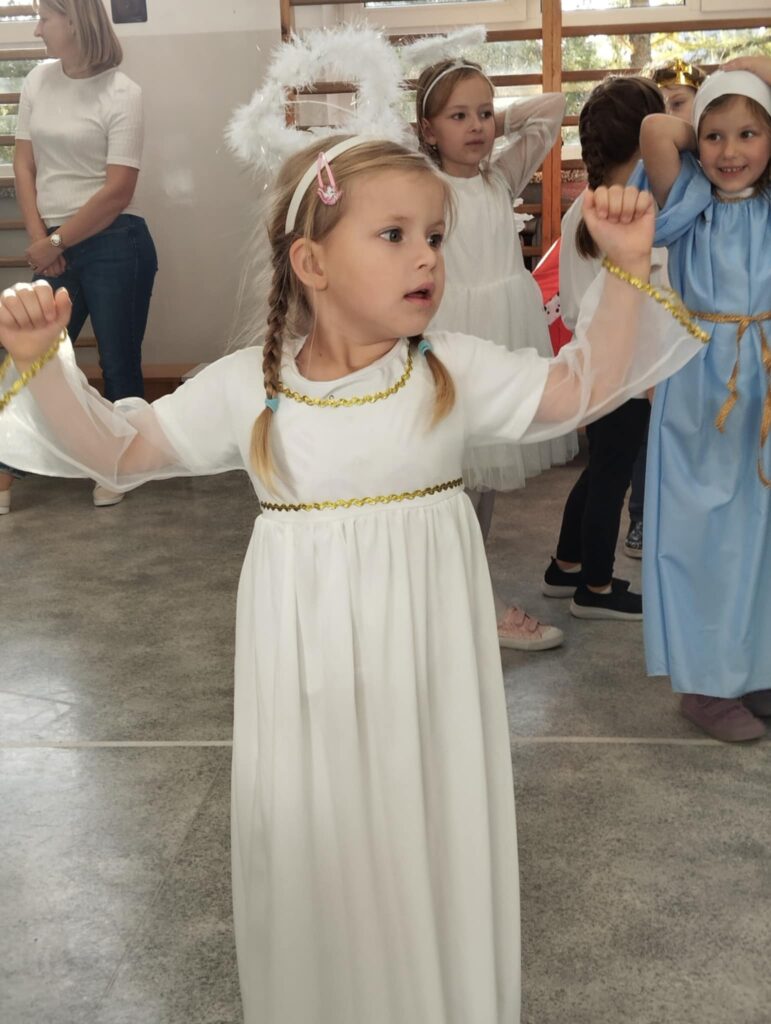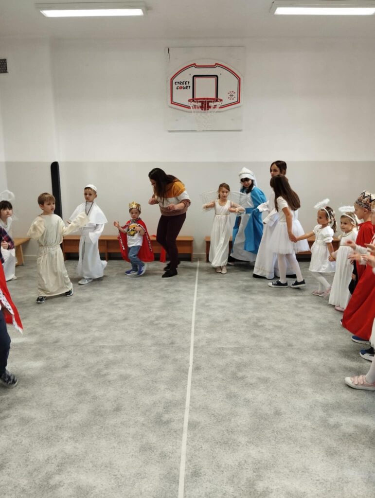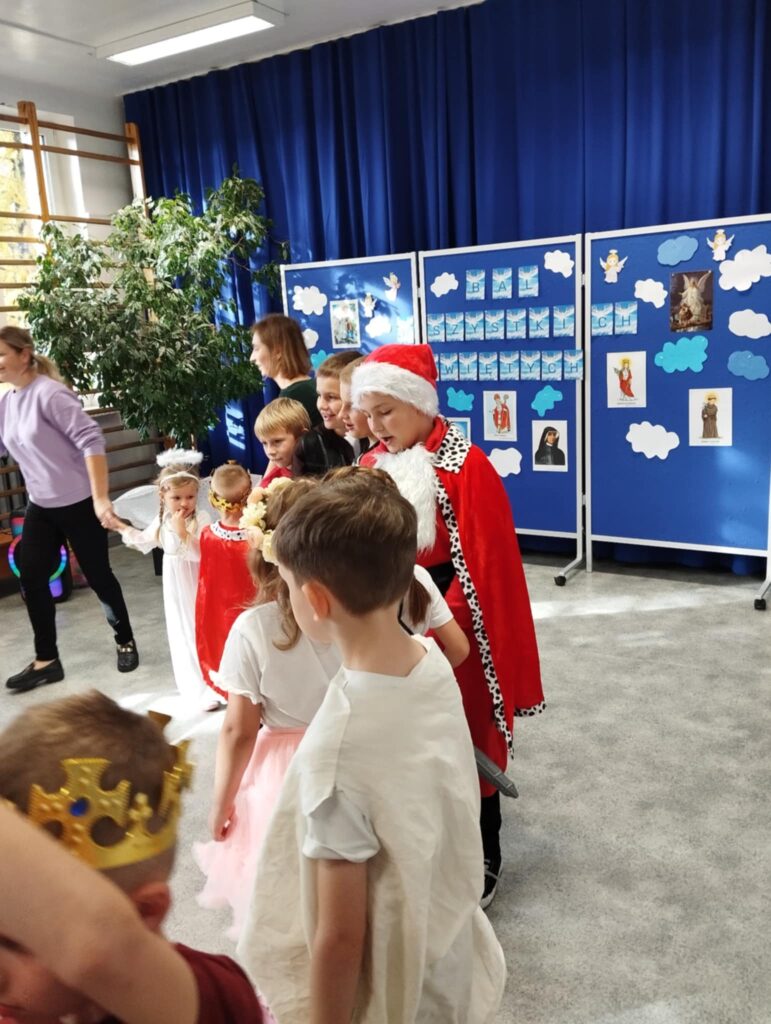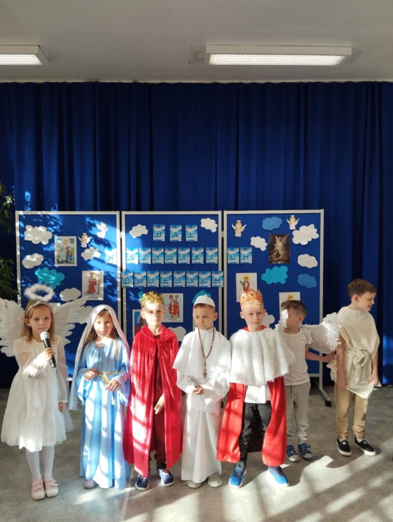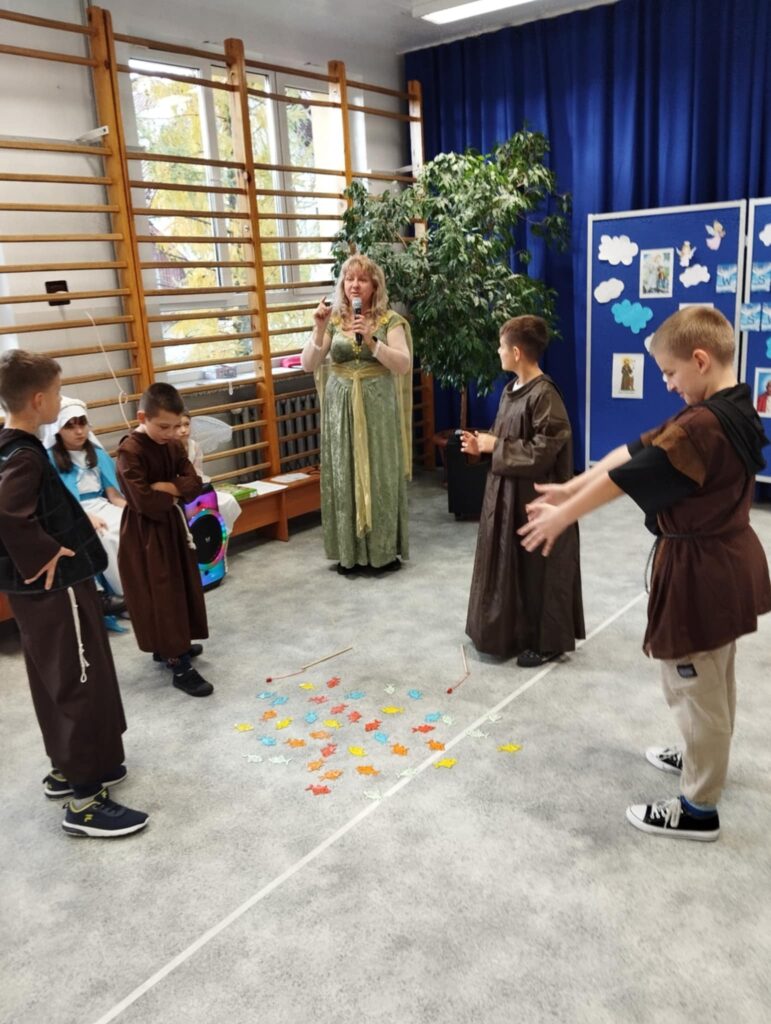 Dnia 30.X.2024r., z racji zbliżającej się Uroczystości Wszystkich Świętych, już po raz kolejny odbył się w naszej szkole Bal Wszystkich Świętych – „ Ze świętymi za pan brat”. Tego dnia było jak w niebie. Przedszkolaki oraz uczniowie klas 1-4 wykazali się dużą pomysłowością i zaprezentowali się w niezwykłych strojach. Na parkiecie można było dostrzec postaci aniołów, ulubionych świętych i błogosławionych Kościoła Katolickiego. Celem tej inicjatywy jest wprowadzanie w atmosferę radości, uświadomienie istoty listopadowego wspominania świętych . Zabawa polegała na wybraniu sobie postaci świętego lub błogosławionego, wymyśleniu stroju dla swojego patrona nie zapominając o jego atrybutach i zaprezentowaniu swojej wiedzy o świętym. Na balu nie mogło zabraknąć dobrej zabawy. Dzieci wesoło bawiły się przy dźwiękach muzyki, tańczyły, śpiewały, brały udział w wesołych rywalizacjach. Był to piękny czas – pełen radości, uśmiechu i wspólnej zabawy.