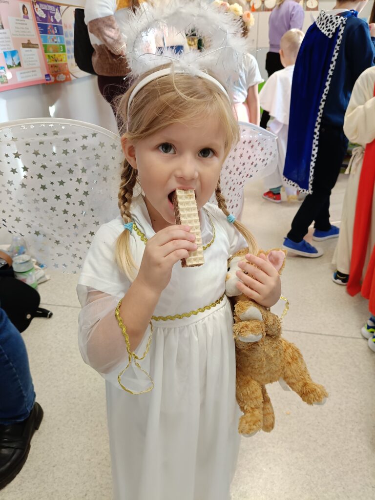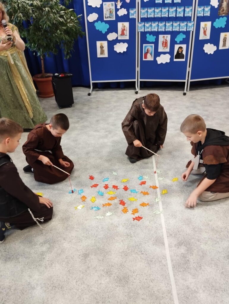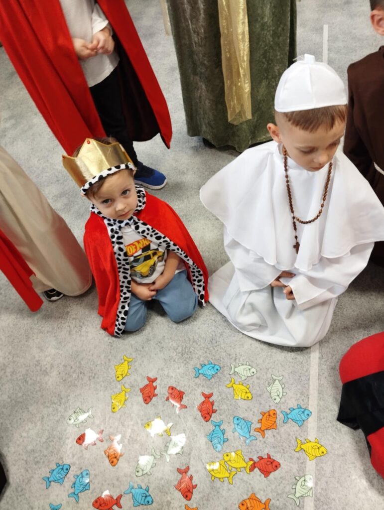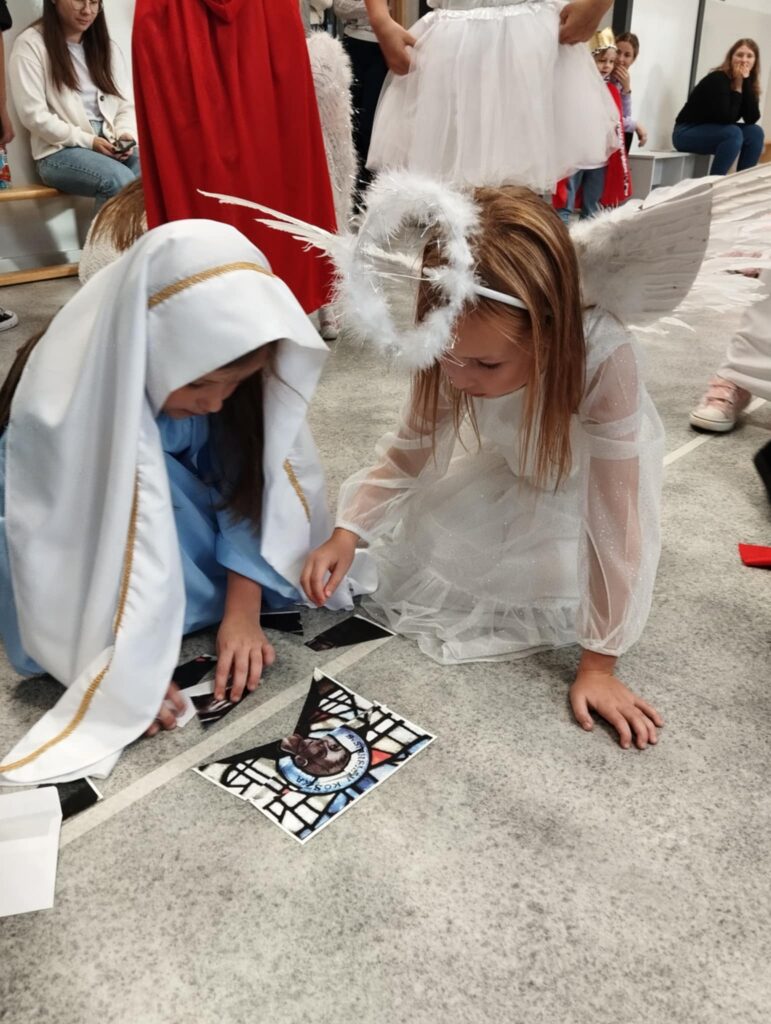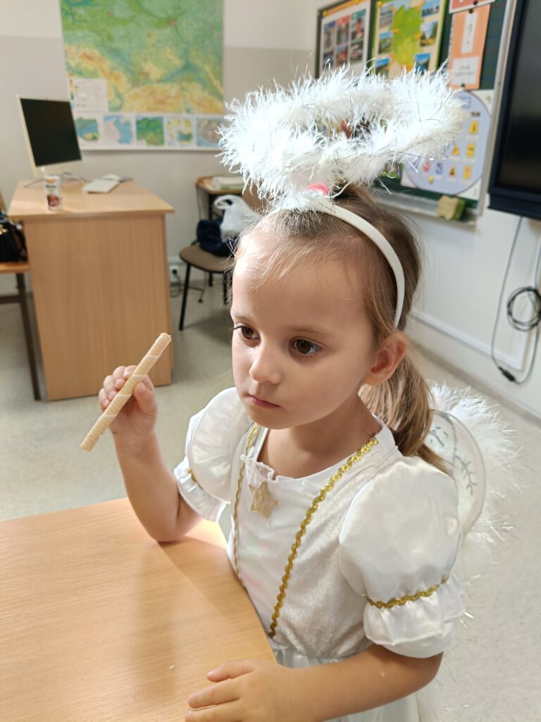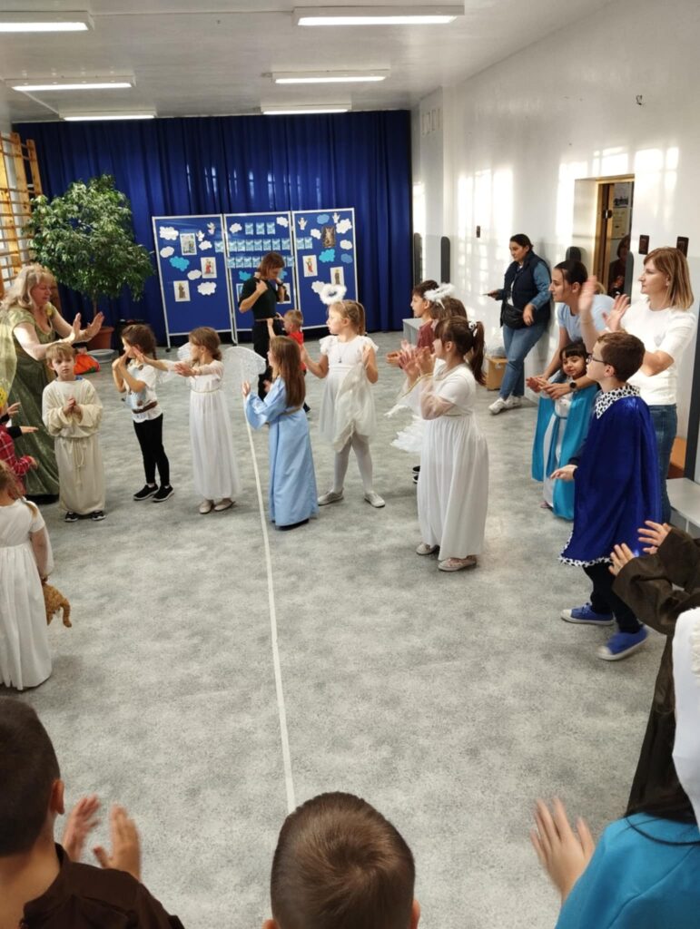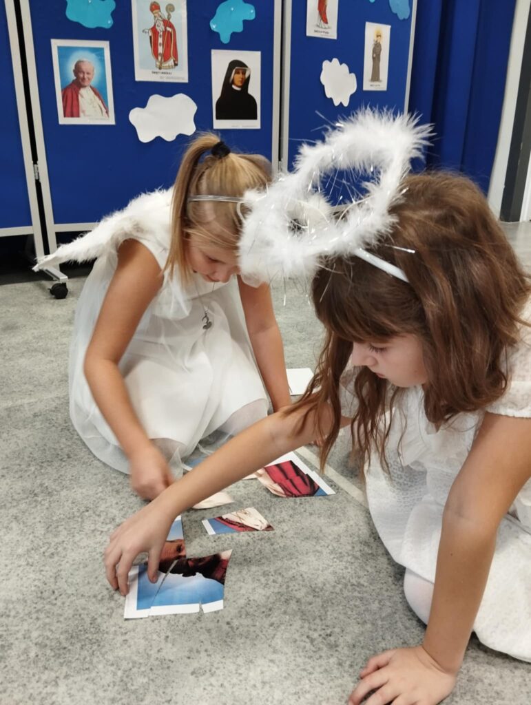 Dnia 30.X.2024r., z racji zbliżającej się Uroczystości Wszystkich Świętych, już po raz kolejny odbył się w naszej szkole Bal Wszystkich Świętych – „ Ze świętymi za pan brat”. Tego dnia było jak w niebie. Przedszkolaki oraz uczniowie klas 1-4 wykazali się dużą pomysłowością i zaprezentowali się w niezwykłych strojach. Na parkiecie można było dostrzec postaci aniołów, ulubionych świętych i błogosławionych Kościoła Katolickiego. Celem tej inicjatywy jest wprowadzanie w atmosferę radości, uświadomienie istoty listopadowego wspominania świętych . Zabawa polegała na wybraniu sobie postaci świętego lub błogosławionego, wymyśleniu stroju dla swojego patrona nie zapominając o jego atrybutach i zaprezentowaniu swojej wiedzy o świętym. Na balu nie mogło zabraknąć dobrej zabawy. Dzieci wesoło bawiły się przy dźwiękach muzyki, tańczyły, śpiewały, brały udział w wesołych rywalizacjach. Był to piękny czas – pełen radości, uśmiechu i wspólnej zabawy.