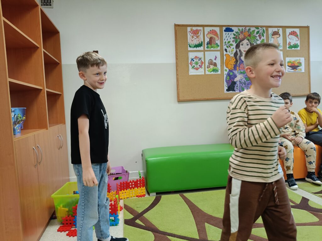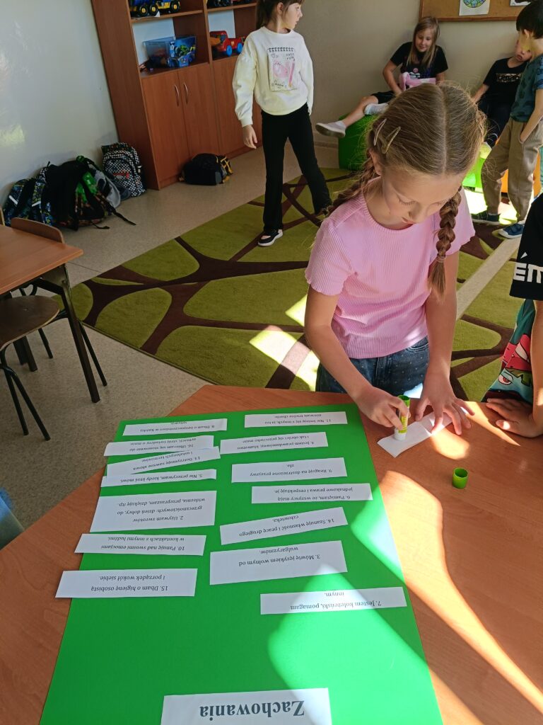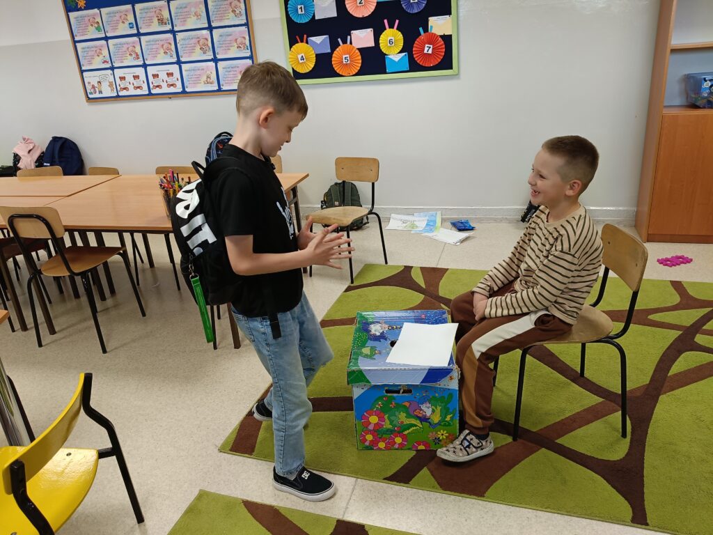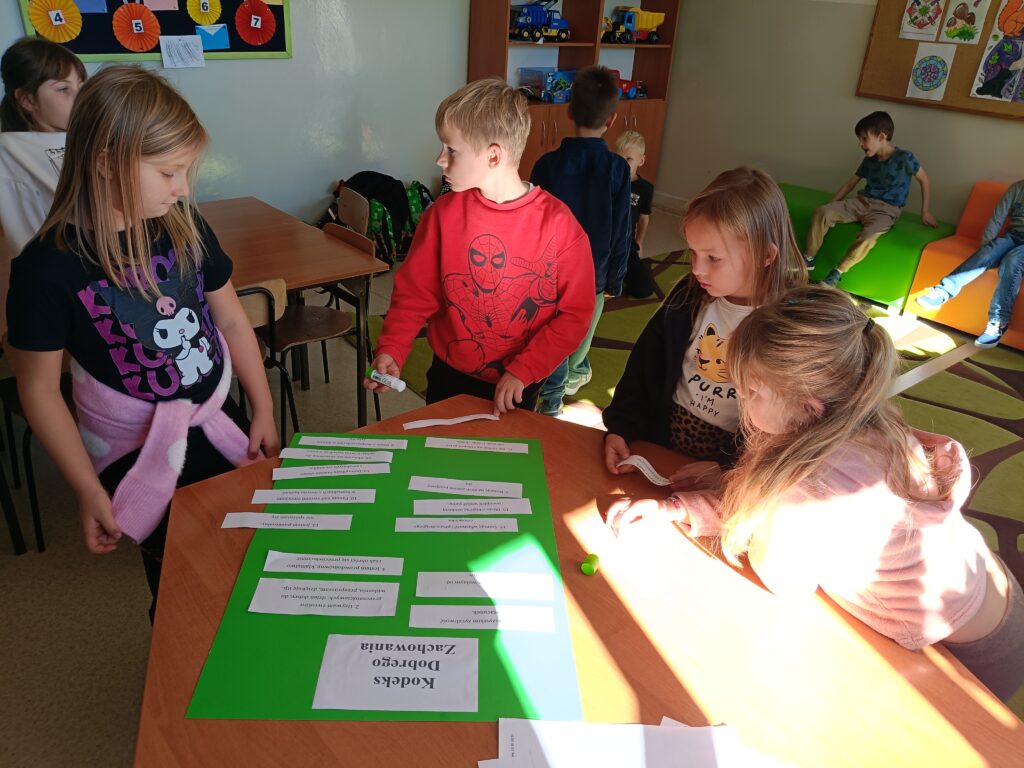Zadanie drugie „Kulturalny bohater dnia- to mogę być Ja!” – wspólnie określaliśmy czym jest szacunek, dlaczego powinniśmy szanować innych ludzi, rówieśników, osoby starsze, niepełnosprawne, znajomych, nieznajomych, a także zwierzęta, cudzą własność oraz samego siebie. Podsumowaniem zajęć było stworzenie z dziećmi Kodeksu Dobrego Zachowania.