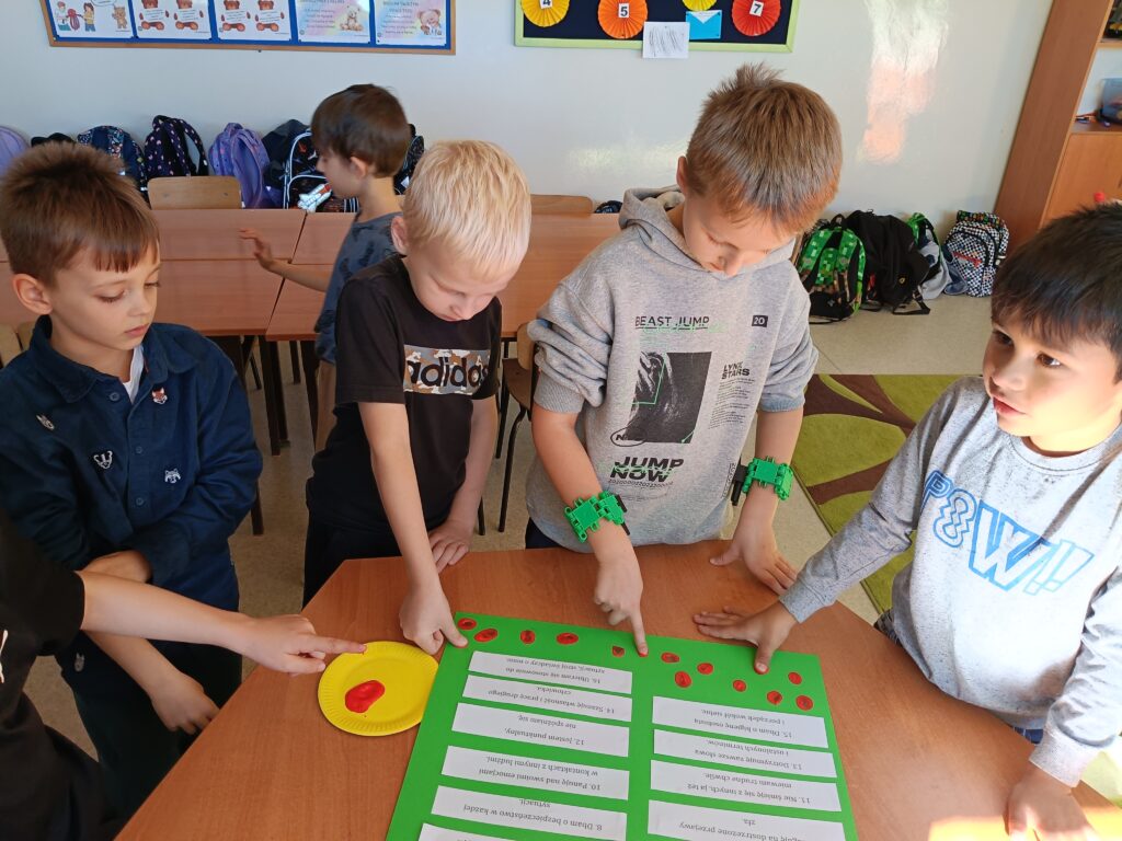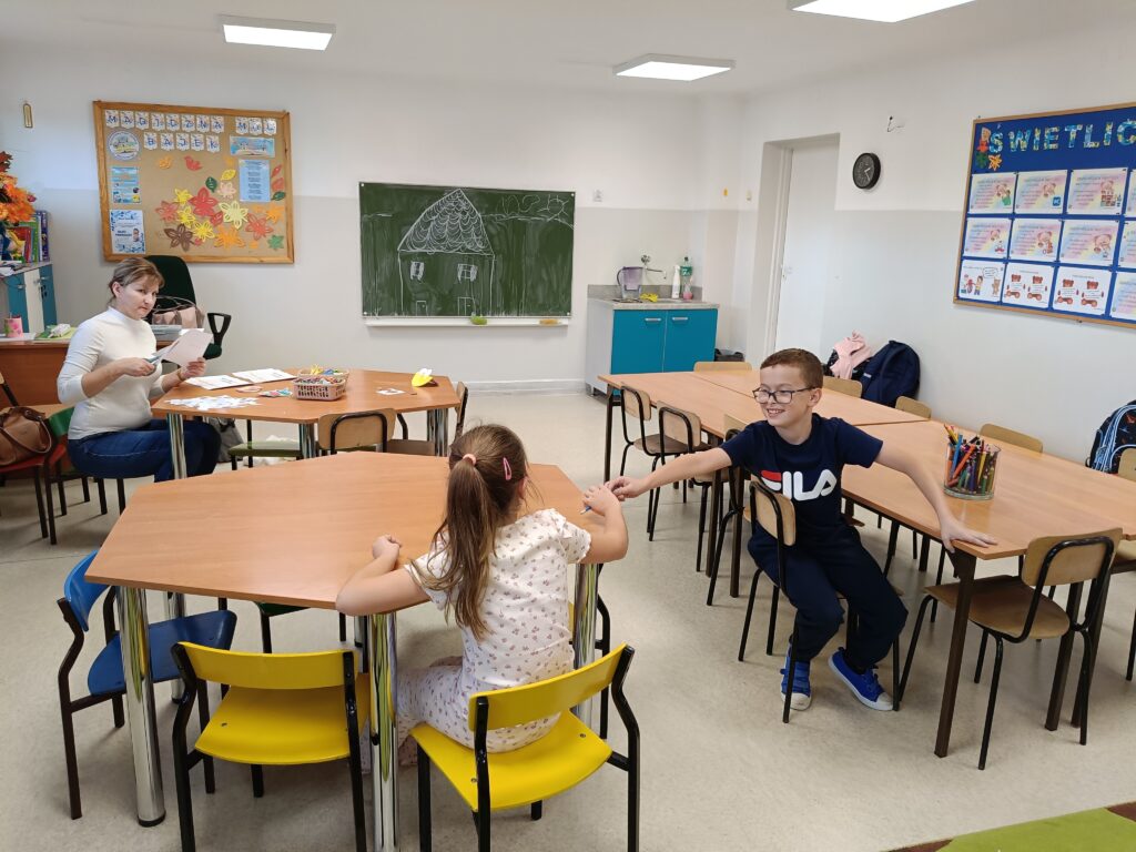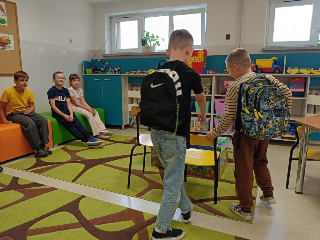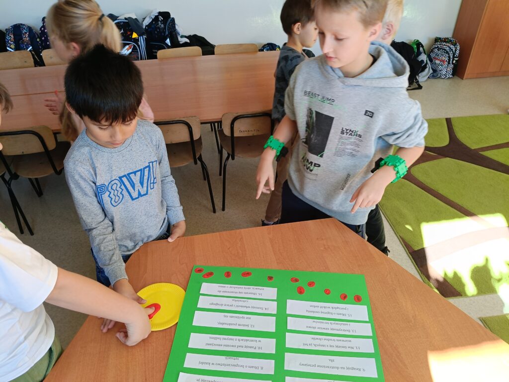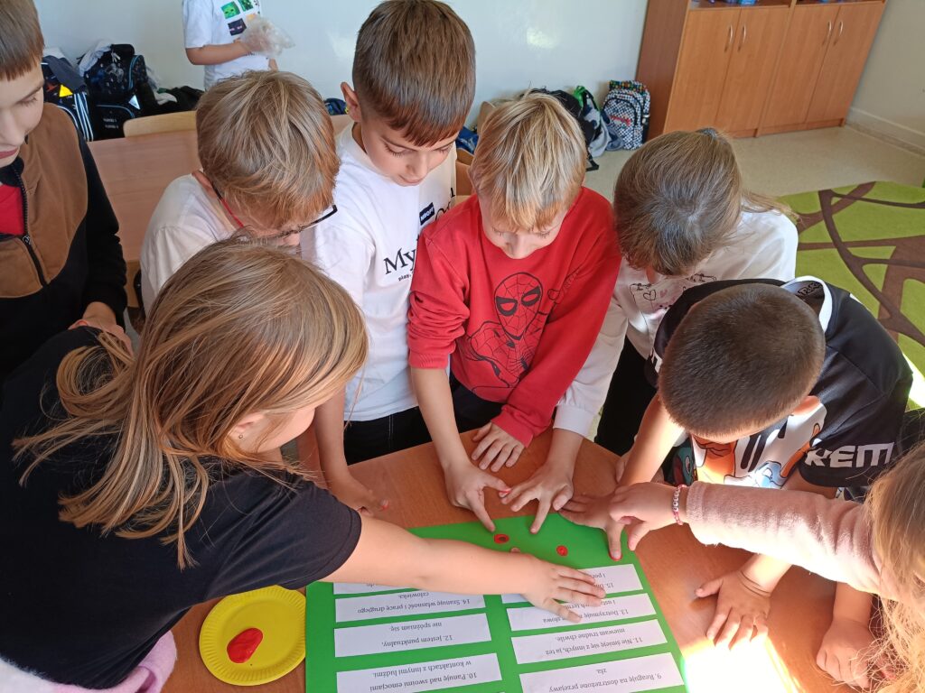 Zadanie drugie „Kulturalny bohater dnia- to mogę być Ja!” – wspólnie określaliśmy czym jest szacunek, dlaczego powinniśmy szanować innych ludzi, rówieśników, osoby starsze, niepełnosprawne, znajomych, nieznajomych, a także zwierzęta, cudzą własność oraz samego siebie. Podsumowaniem zajęć było stworzenie z dziećmi Kodeksu Dobrego Zachowania.