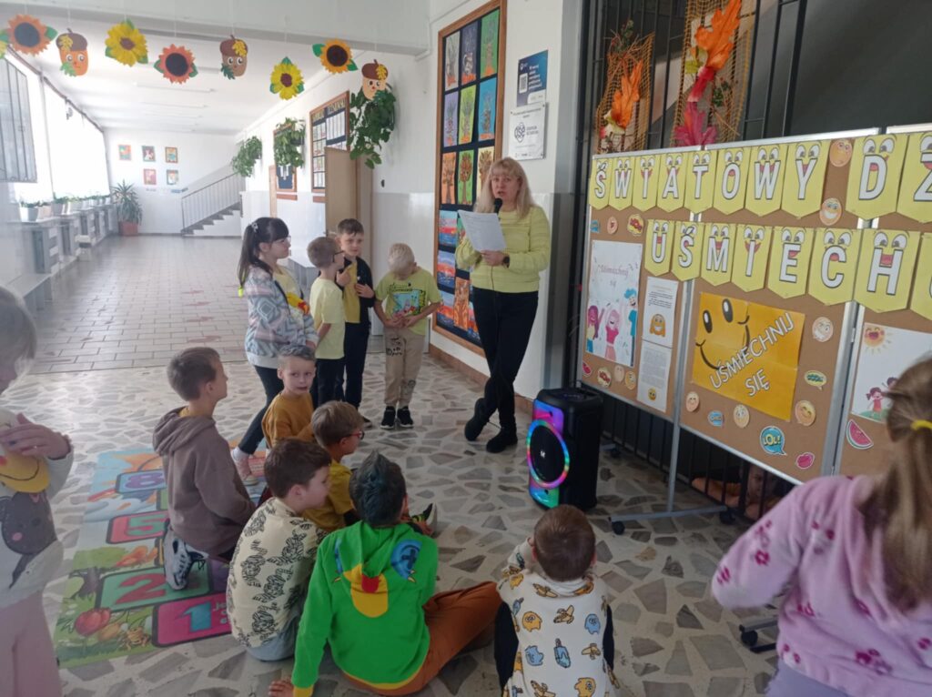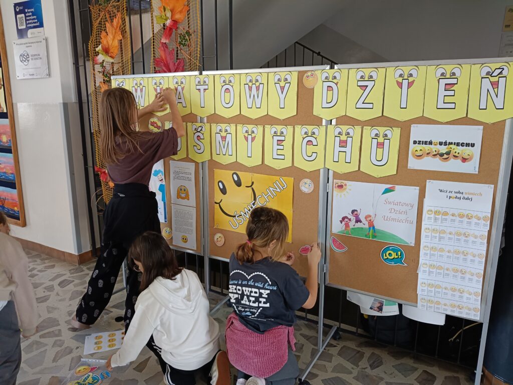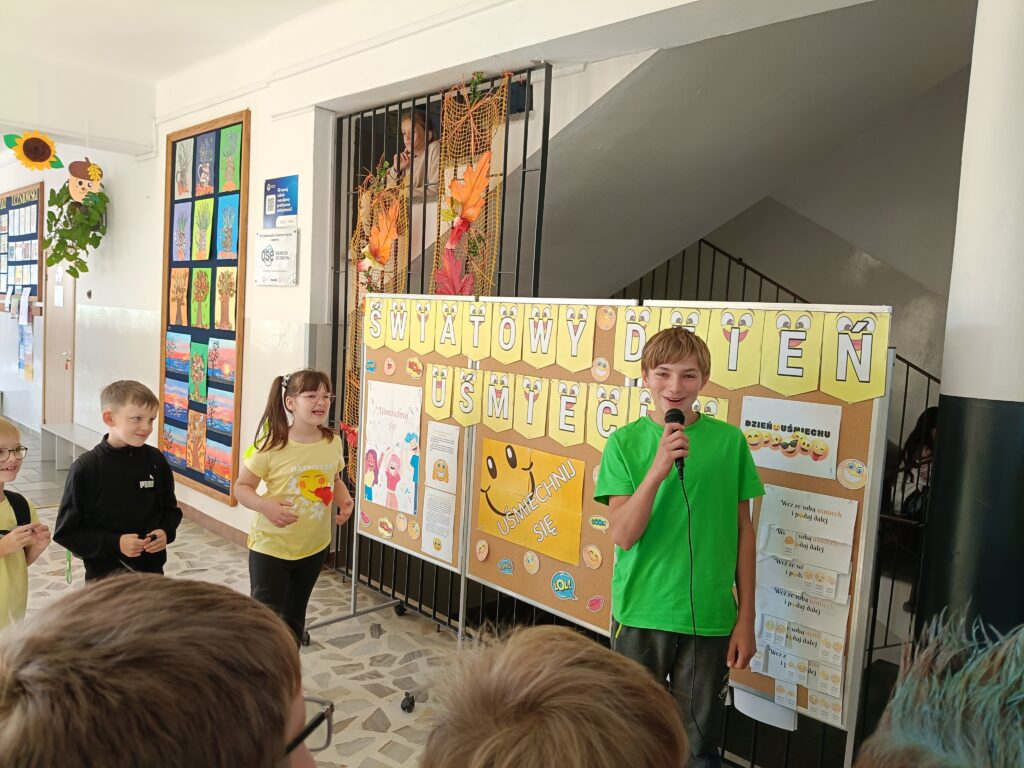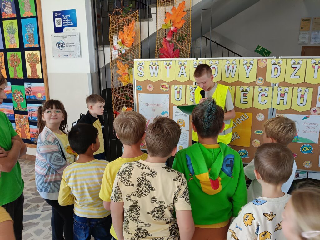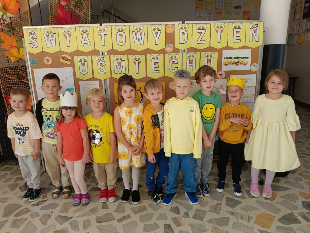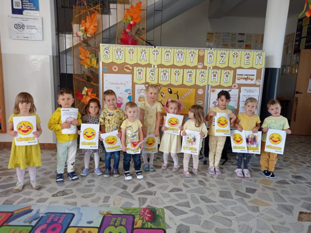 Zabawy w tym dniu miały każdego ucznia i przedszkolaka naszej szkoły wprawić w dobry nastrój i wywołać dużo uśmiechu na twarzy. Doskonaliliśmy umiejętność rozpoznawania i nazywania uczuć. Dzieci na świetlicy wysłuchały bajki terapeutycznej „Śmiecholandia” a następnie rozmawialiśmy o emocjach. Wykonaliśmy wesołe prace plastyczne oraz uczestniczyliśmy w zabawach ruchowych. Członkowie Szkolnego Koła Wolontariatu „Złote serca” z grupy młodszej przygotowali dowcipy i zagadki, którymi dzielili się z innymi uczniami podczas przerw międzylekcyjnych. Tego dnia w szkole widać było na twarzach dzieci słodkie uśmiechy.