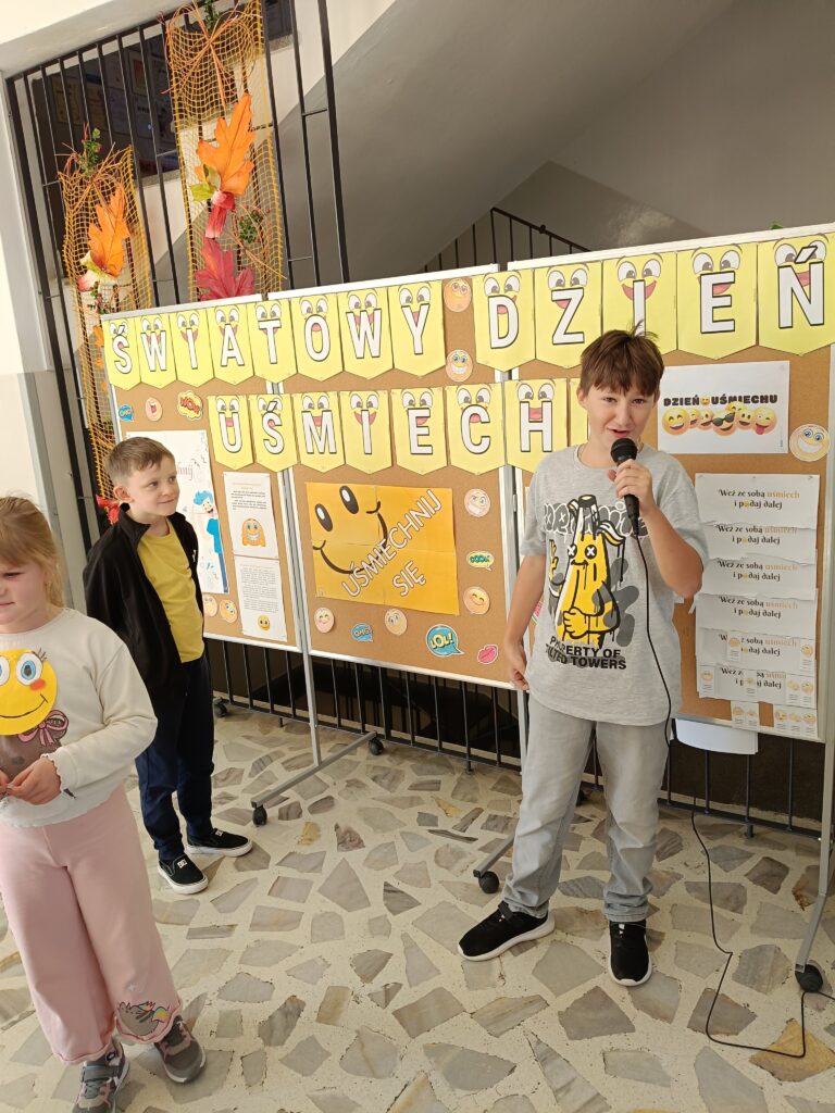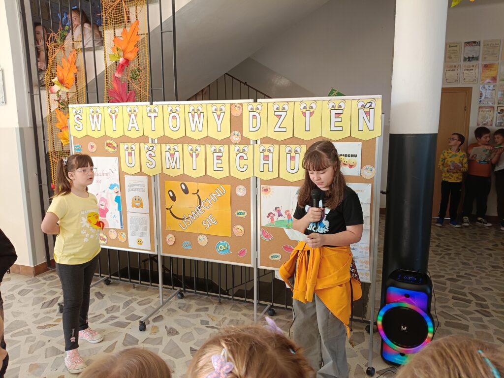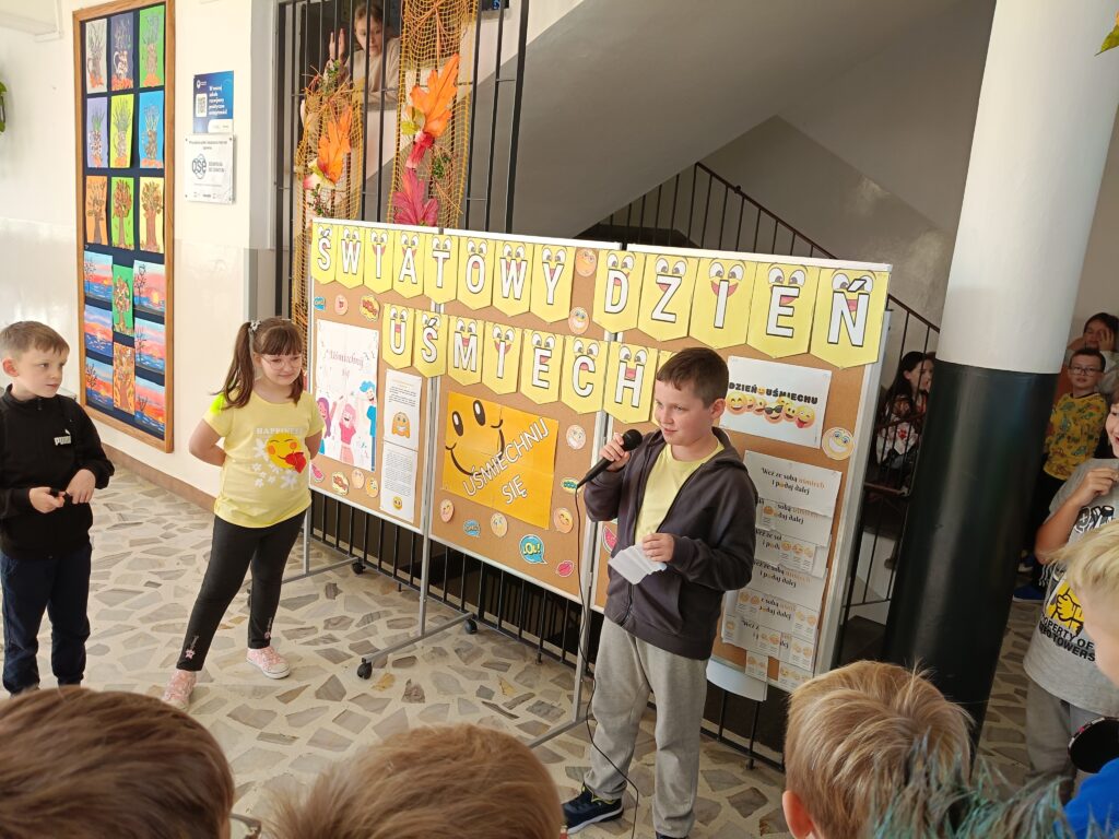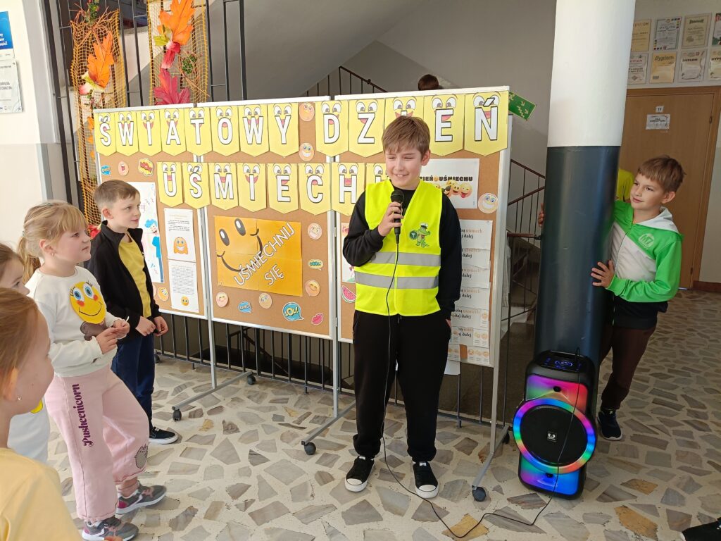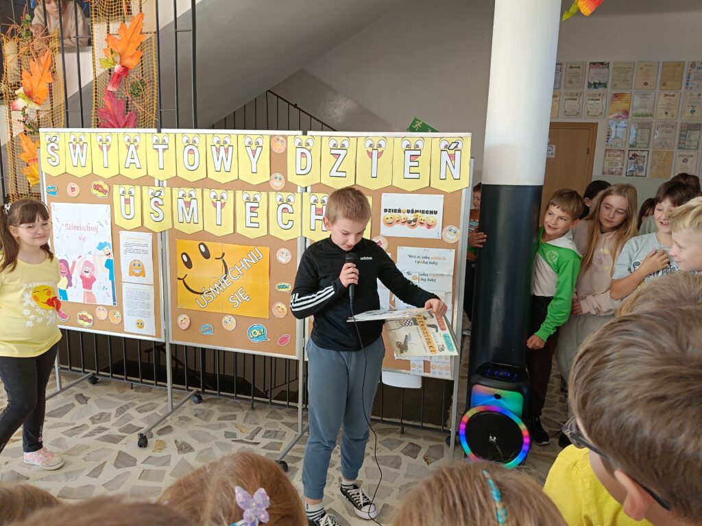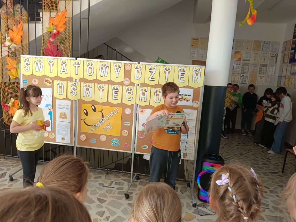Zabawy w tym dniu miały każdego ucznia i przedszkolaka naszej szkoły wprawić w dobry nastrój i wywołać dużo uśmiechu na twarzy. Doskonaliliśmy umiejętność rozpoznawania i nazywania uczuć. Dzieci na świetlicy wysłuchały bajki terapeutycznej „Śmiecholandia” a następnie rozmawialiśmy o emocjach. Wykonaliśmy wesołe prace plastyczne oraz uczestniczyliśmy w zabawach ruchowych. Członkowie Szkolnego Koła Wolontariatu „Złote serca” z grupy młodszej przygotowali dowcipy i zagadki, którymi dzielili się z innymi uczniami podczas przerw międzylekcyjnych. Tego dnia w szkole widać było na twarzach dzieci słodkie uśmiechy.