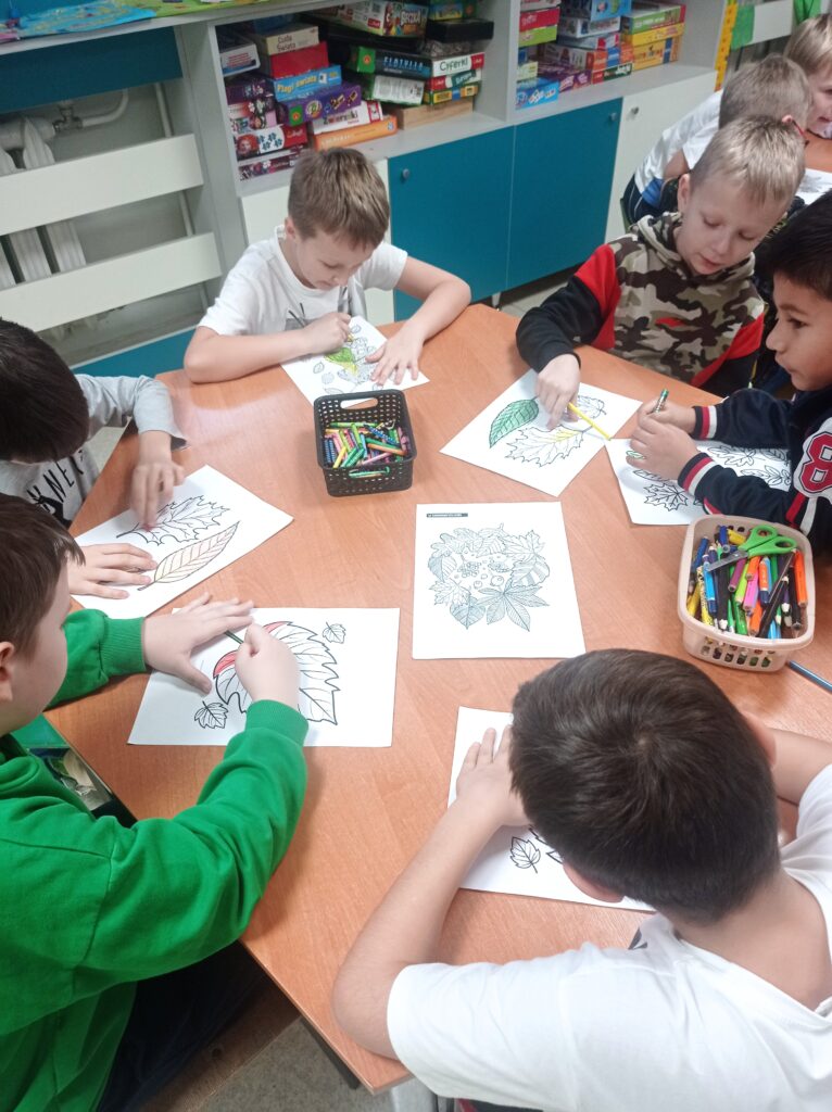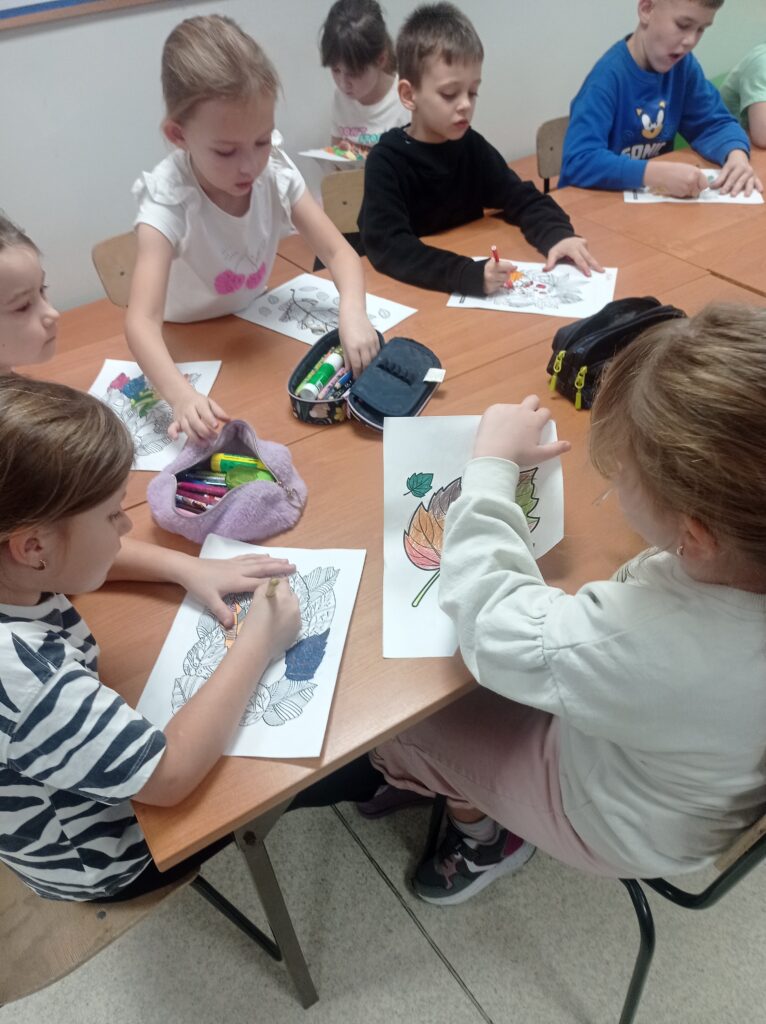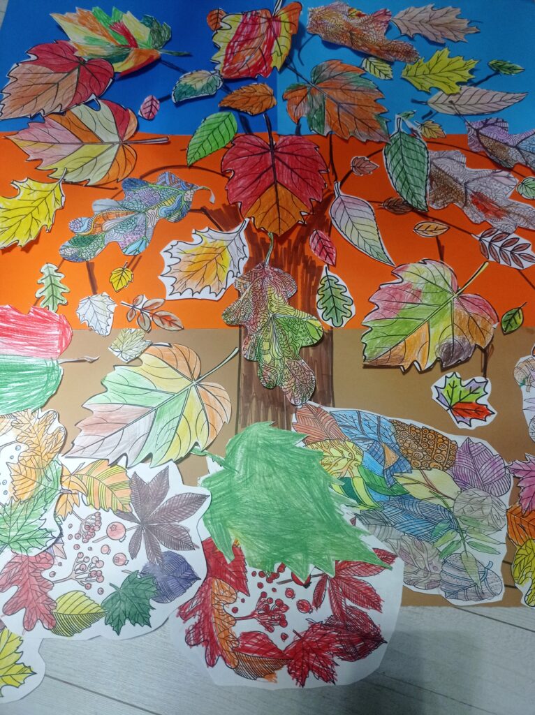 Kolejnym etapem była praca plastyczna. Dzieci najpierw malowały liście w barwach jesieni, następnie je wycinały, a z wykonanych elementów wspólnie stworzyły duże jesienne drzewo.