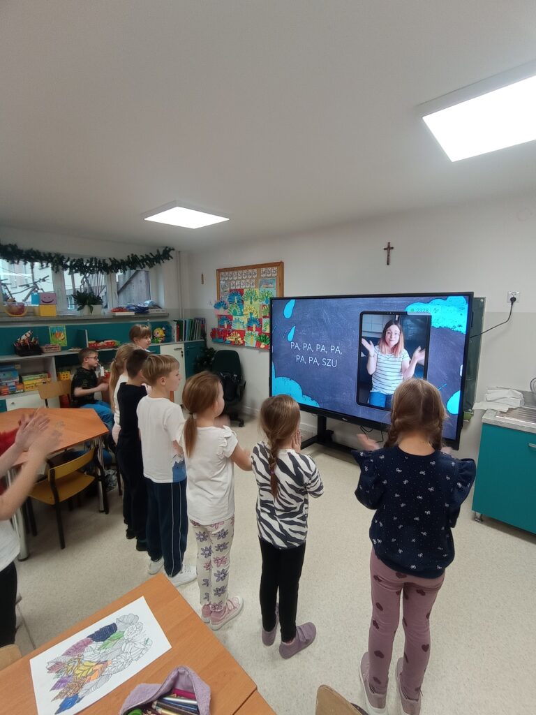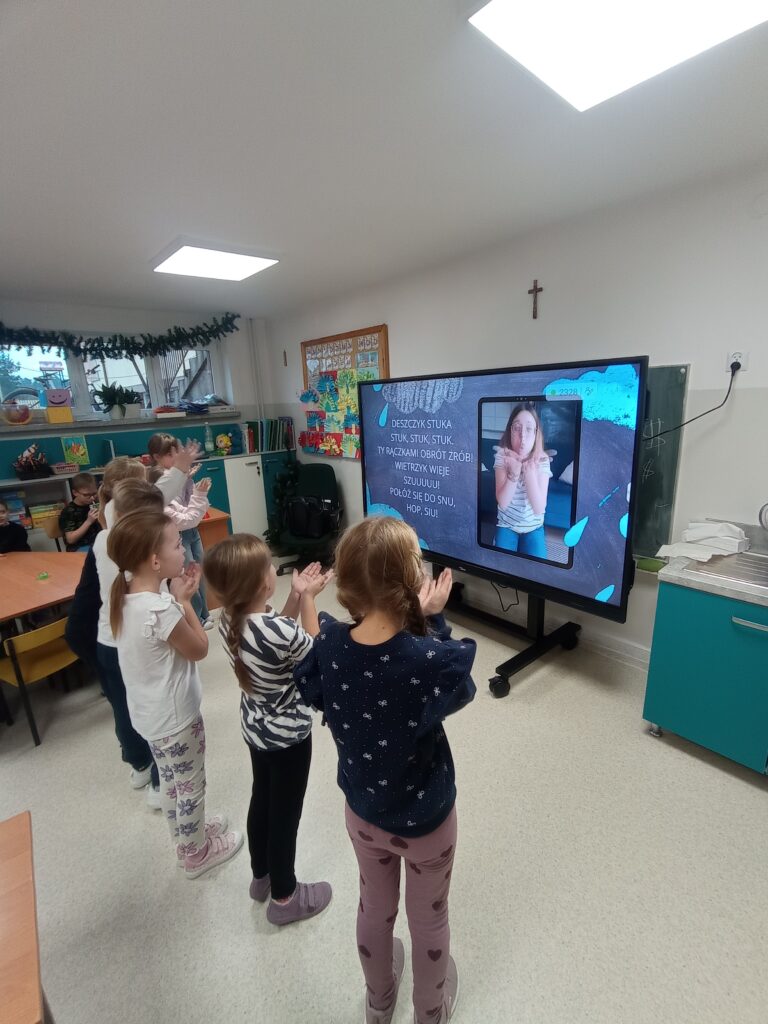 W dalszej części zajęć dzieci nauczyły się piosenki pokazywanej „Deszczyk pada kap, kap”, którą wykonywały z dużym zaangażowaniem.