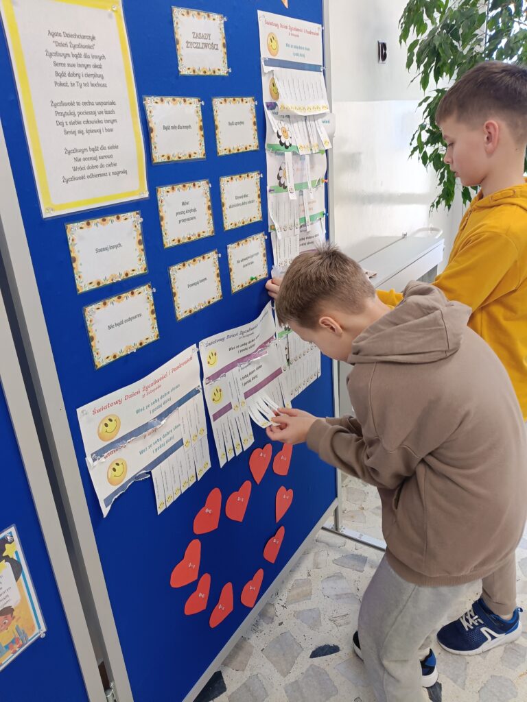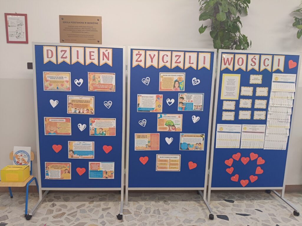 Świętowanie tegorocznego Dnia Życzliwości rozpoczęliśmy od początku tygodnia. Uczniowie w tym czasie starali się być dla siebie nawzajem wyjątkowo życzliwi. Podopieczni świetlicy przygotowali „Drzewko życzliwości”, na którym codziennie umieszczali listki dobrych uczynków. Wolontariusze z młodszej grupy przygotowali „Życzliwą pocztę” do której uczniowie wkładali życzliwe liściki, pozdrowienia, laurki dla innych uczniów i uczennic oraz nauczycieli. Przedszkolaki oraz uczniowie uczęszczający na zajęcia świetlicowe uczestniczyły w różnorodnych aktywnościach związanych z życzliwością. W piątek uczniowie i przedszkolaki przyszli do szkoły ubrani na żółto – kolor symbolizujący radość i optymizm. Uczniowie klas 4-6 ze szkolnego koła wolontariatu „Złote serca” przygotowali apel, na którym zaprezentowali informacje i ciekawostki na temat serdeczności, przyjaźni i życzliwości.