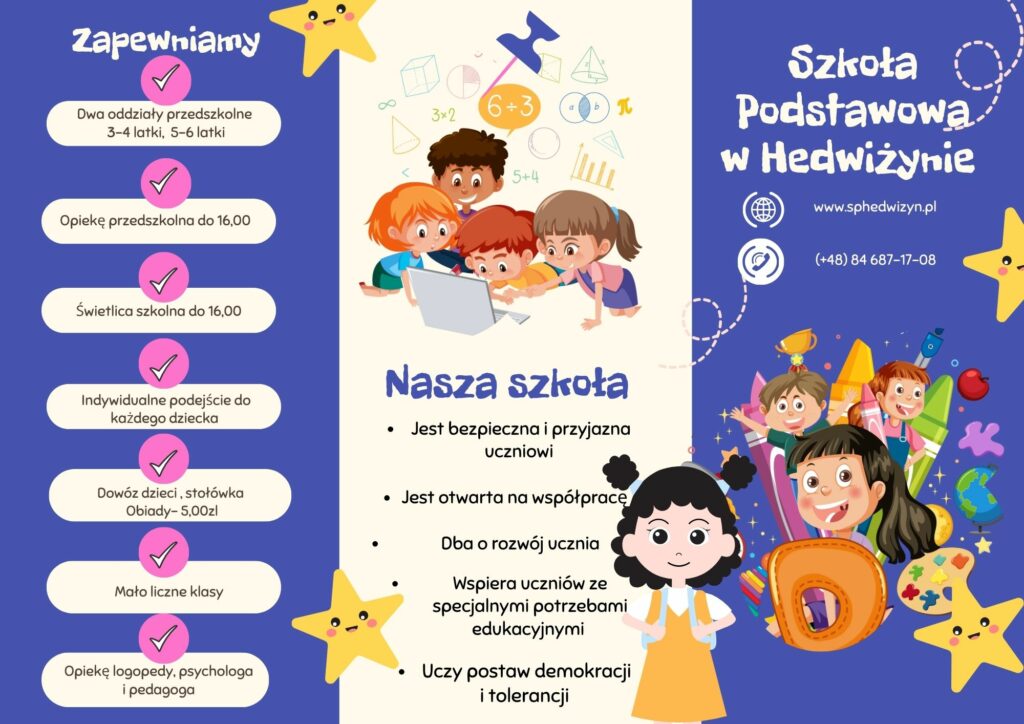 W dniach od 2 lutego do 17 lutego 2026 roku w Szkole Podstawowej w Hedwiżynie prowadzona będzie rekrutacja do klasy I szkoły podstawowej oraz oddziałów przedszkolnych na rok szkolny 2026/2027.